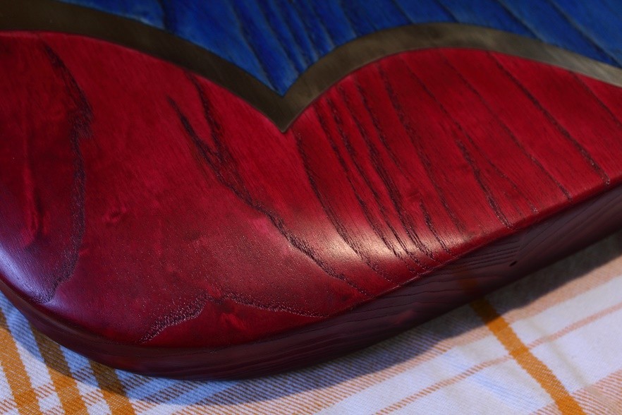 Der Hals ist mit Klarlack lackiert und der Korpus wird gerade mit Hartwachsöl behandelt. Das Hartwachsöl is von PNZ und hat trotz das es eine leichten Gelbstich hat das Blau der Beize gut erhalten und kein grün draus gemacht.