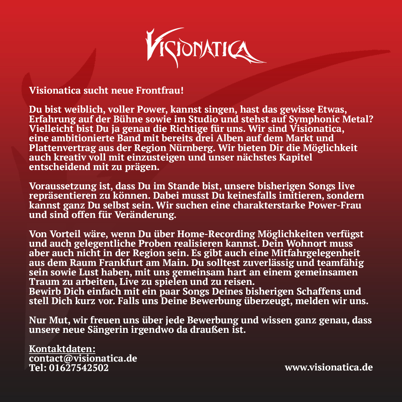 Voraussetzung ist, dass Du im Stande bist, unsere bisherigen Songs live repräsentieren zu können. Dabei musst Du keinesfalls imitieren, sondern kannst ganz Du selbst sein. Wir suchen eine charakterstarke Power-Frau und sind offen für Veränderung.