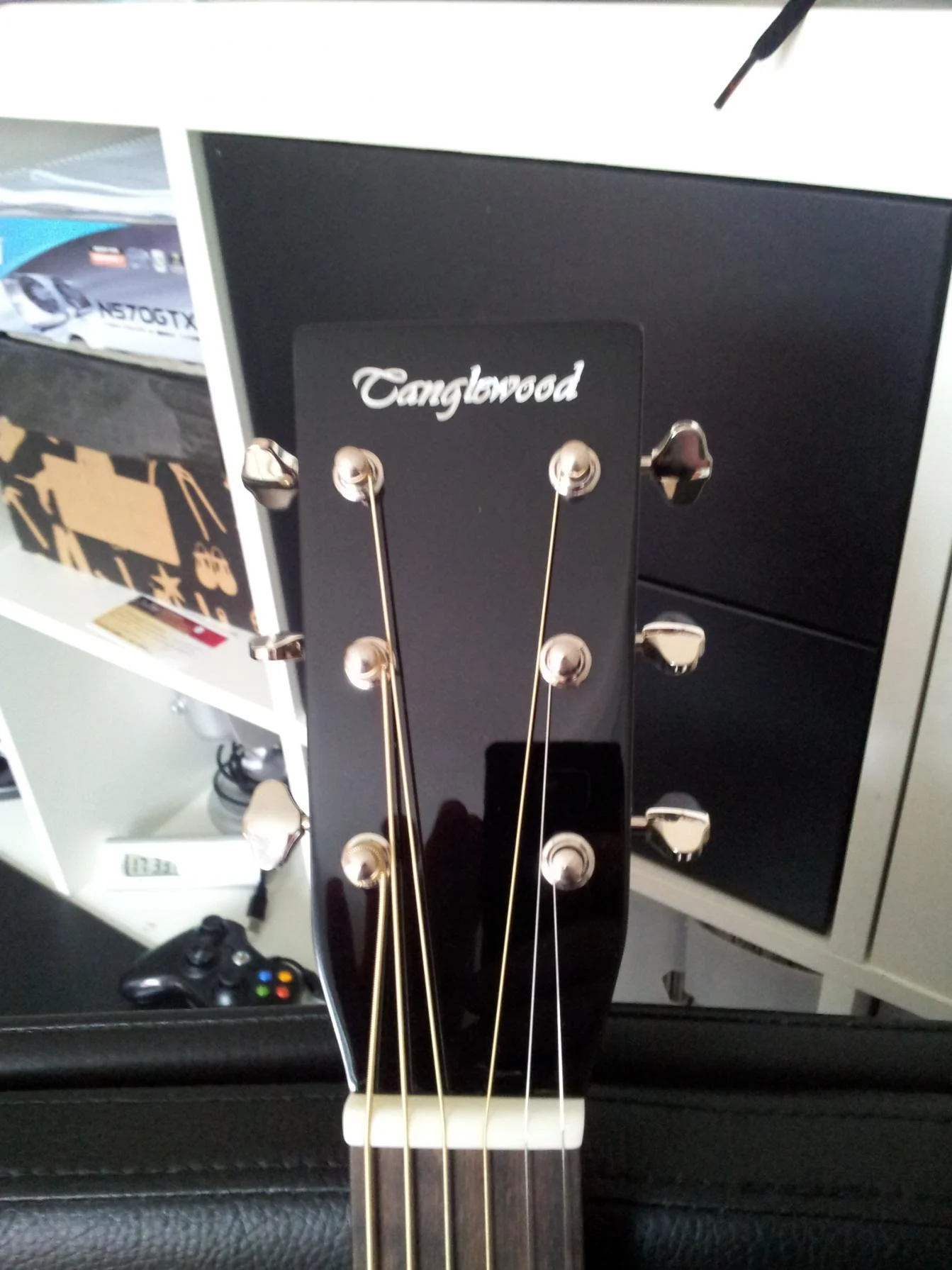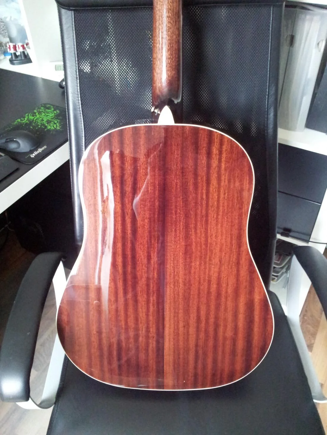 Was ich unbedingt loswerden muss: Die Gitarre sieht einfach nur wunderschön aus. Bei vielen Gitarren interessiert es mich nicht so sehr aber bei der kann man einfach nicht wegschauen. Die Gitarre ist viel weniger orange als sie auf den Bildern aussieht, sondern in einem richtig satten Tabacco Sunburst, also eher braun-orange, der Palisandersteg passt perfekt dazu und auch die dunkle rot-braune Lackierung an Boden zu Zargen passt sich perfekt ein. Die Gitarre ist einfach total stimmig, da stört mich fast ein wenig der Tonabnehmer mit Buchse, der das Vintage-Feeling ein wenig rausnimmt. Ich versuche am Wochenende mal Bilder zu machen wo die Farbe mehr zur Geltung kommt, ich werde mir einfach mal die Spiegelreflex von meinem Vater leihen^^ Ich habe mir heute noch beim großen T Saiten bestellt und auch ein GEWA Tortoise-Pickguard zum selbst schnibbeln, mal schauen ob ich dann ein Tanglewood-PG oder vllt. sogar ein Gibson J-45 PG draufpappe *g*
