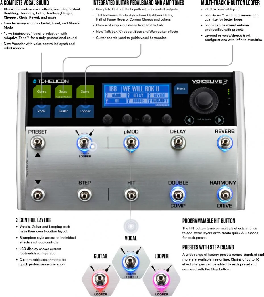 Hab mir das Teil zugelegt, weil es allerhand Effekte fĂŒr den Gesang hat, und auch noch ausreichend fĂŒr die Gitarre. Herrlich, dass ich in Zukunft auch nur einen Bodentreter schleppen muss. Wird sicher noch etwas dauern bis man die einzelnen Setups abgespeichert hat so wie man sie haben will, aber das ist es Wert. Ich finde den Sound und das Bedienkonzept erstklassig - z.B. dass man sich die Umschalter fĂŒr Gitarre und Gesang auf einen Layer legen kann und so ohne Probleme Zugriff auf die benötigten Effekte hat.