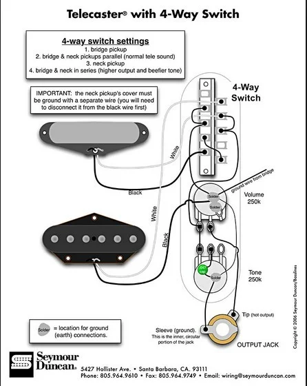 Jetzt gibt es Schaltpläne für den 4way Switch, da gehen zwei Kabel weg: eines auf Masse am Vol-Poti, und eines an die linke Lötöse - oder wie heisst das -am Vol-Poti.