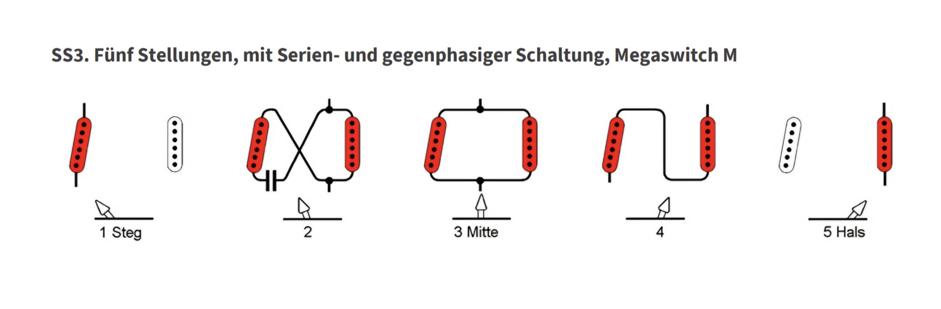 meine Tele hat einen 5 Wege Superswitch eingebaut. Pos 1, 3 und 5 bieten die üblichen 3 Sounds. Pos 2 liefert Neck u. Steg out of Phase parallel, Pos. 4 Neck u. Steg seriell. Großartig welche Sound-Vielfalt mit nur zwei Singlecoils möglich ist.