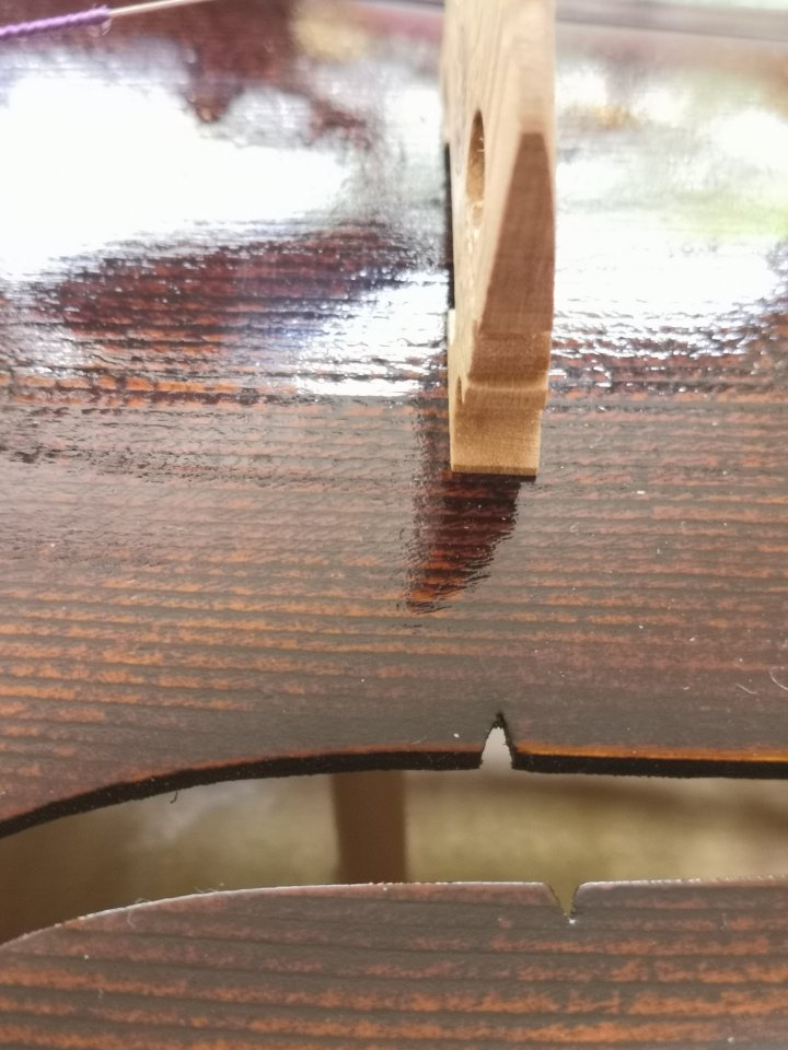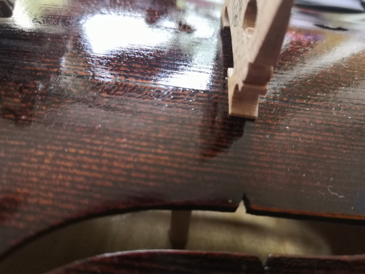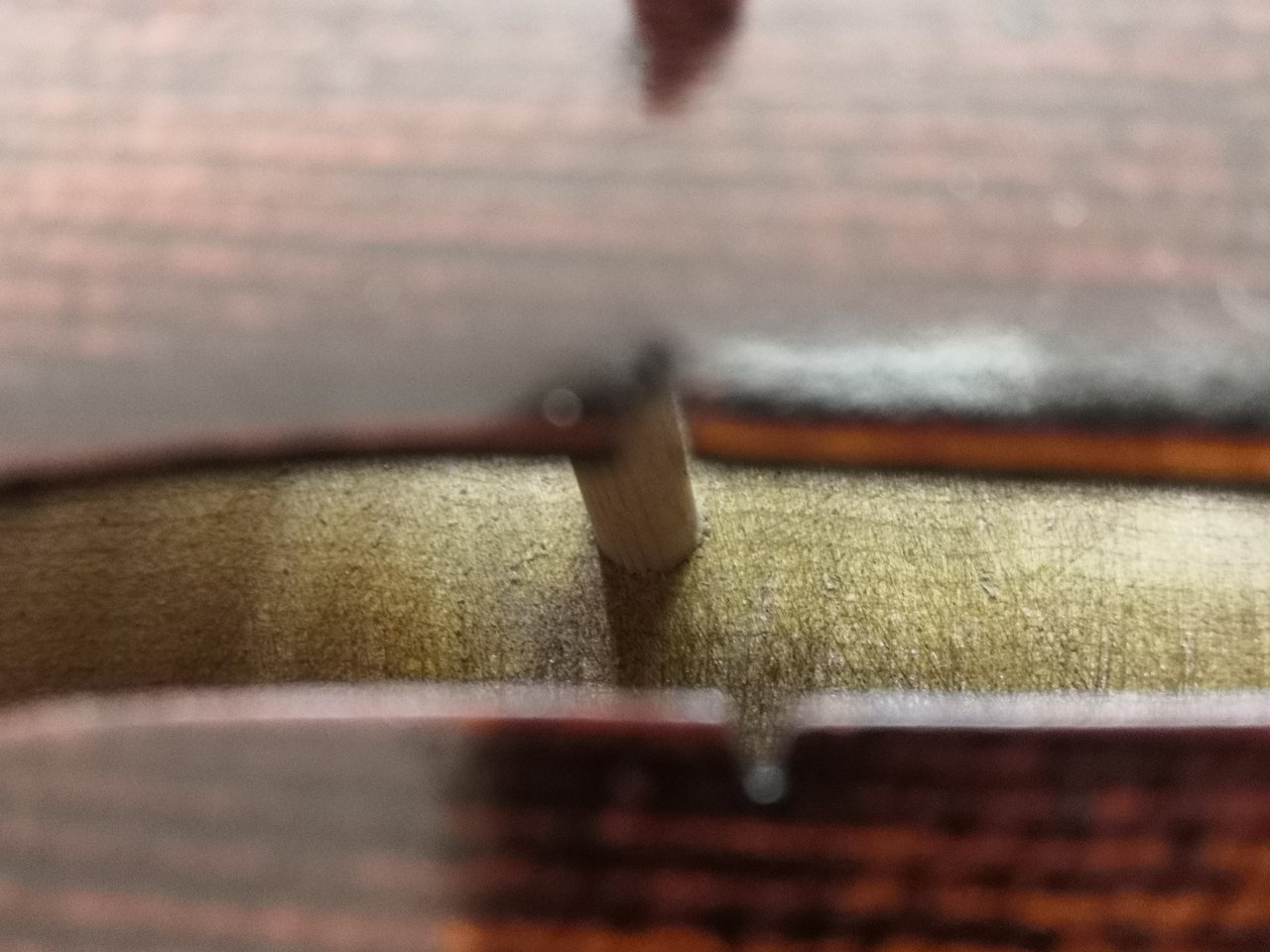 Stimmstock...passte zwar und saß flächig oben und unten. Nur leider war er dabei schräg, die Hirnflächen voller Holzfusseln als hätte jemand ein stumpfes Messer benutzt. Wer macht sowas nur? Hinter dem Stegfuss an der Stelle des Stimmstocks spürbar eine Erhebung der Decke , da wäre es nur eine Frage der Zeit bis zum Stimmriss. Finger weg, hatte ich schon 2x mit Geigen vom T.