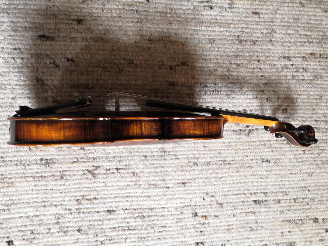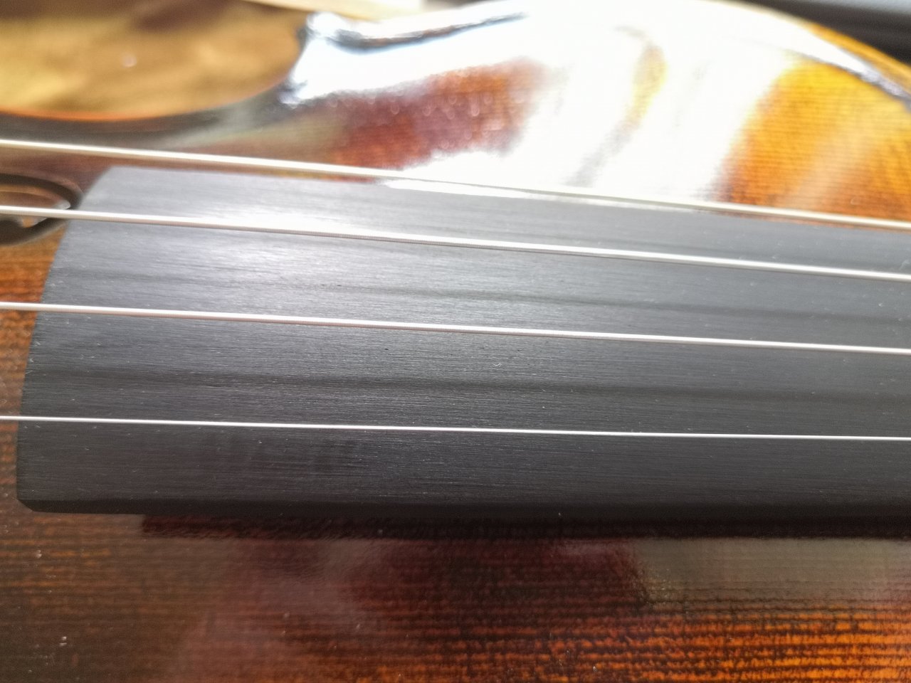 Das Griffbrett war zwar konkav aber teils waren noch Spuren der Hobelmaschine ersichtlich, hätte man mal schleifen und polieren müssen. Auch an den Seiten des Halses an den Übergängen zum Griffbrett leichte Anzeichen von nachträglicher Holztrocknung zu spüren. Der Sattel war bis auf G-Saite gleichmäßig gekerbt aber die Saitenlage war zu hoch mit 1mm. Auch hier wäre Nachbessern angesagt gewesen oder gleich ein neuer Sattel. Das wäre der einzige Arbeitsschritt den ich mir noch angetan hätte wenn die Grundsubstanz und Klang der Geige überzeugt hätte.