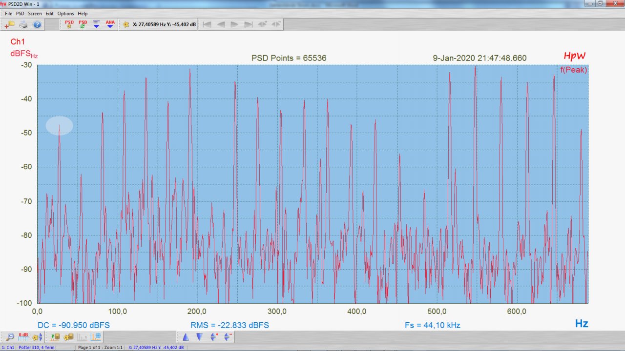 Den Aufbau kann man sicher noch verbessern, aber mir ging es ja nur darum, grundsätzlich nachzuweisen, dass die Grundfrequenz 27,5 (hier 27,4 Hz) tatsächlich im Spektrum vorhanden ist mit einer durchaus noch wahrnehmbaren Amplitude.
