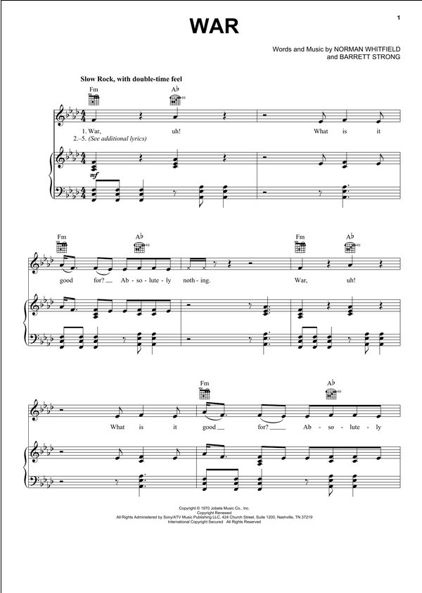 Da muß man aufpassen. Die Schulweisheit, daß Moll traurig und Dur fröhlich sei, ist mit großer Vorsicht zu genießen, und erst recht, wenn der Song einen bluesigen-erdigen Charakter hat. Die andere Schulweisheit, daß Blues-Songs langsame, traurige Lieder der unterdrückten und versklavten Schwarzen seien, ist auch ziemlicher Unsinn. Für mich hat der Song von musikalischer Seite absoluten party- und tanzcharakter. Der Refrain: "What is it good for? Absolutely nothing!" hat Mitgröhlcharakter, und deshalb ist der Song in der Zeit des Vietnamkrieges und der amerikanischen Antikriegsbewegung in den 70ern berühmt geworden.Weiterhin aufgefallen ist mir, dass das Lied im Moll verfasst wurde, wahrscheinlich um auf die Nachricht des Liedes, nämlich das