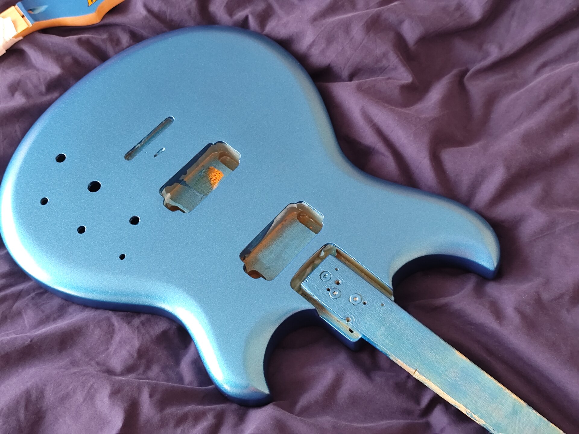 Die Gitarre habe ich nun außer Sicht- und Reichweite in den Keller verbannt, damit der Lack vor dem letzten Schliff und Politur die nächsten 3 bis 4 Wochen ausgasen und aushärten kann.