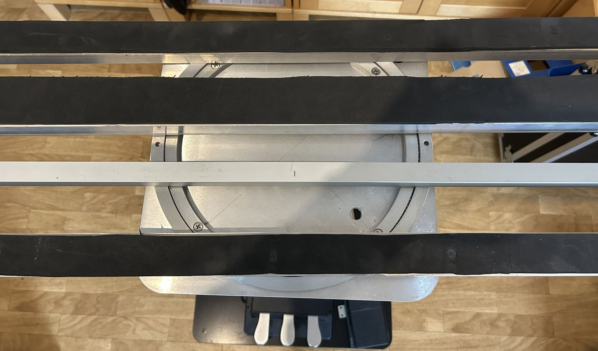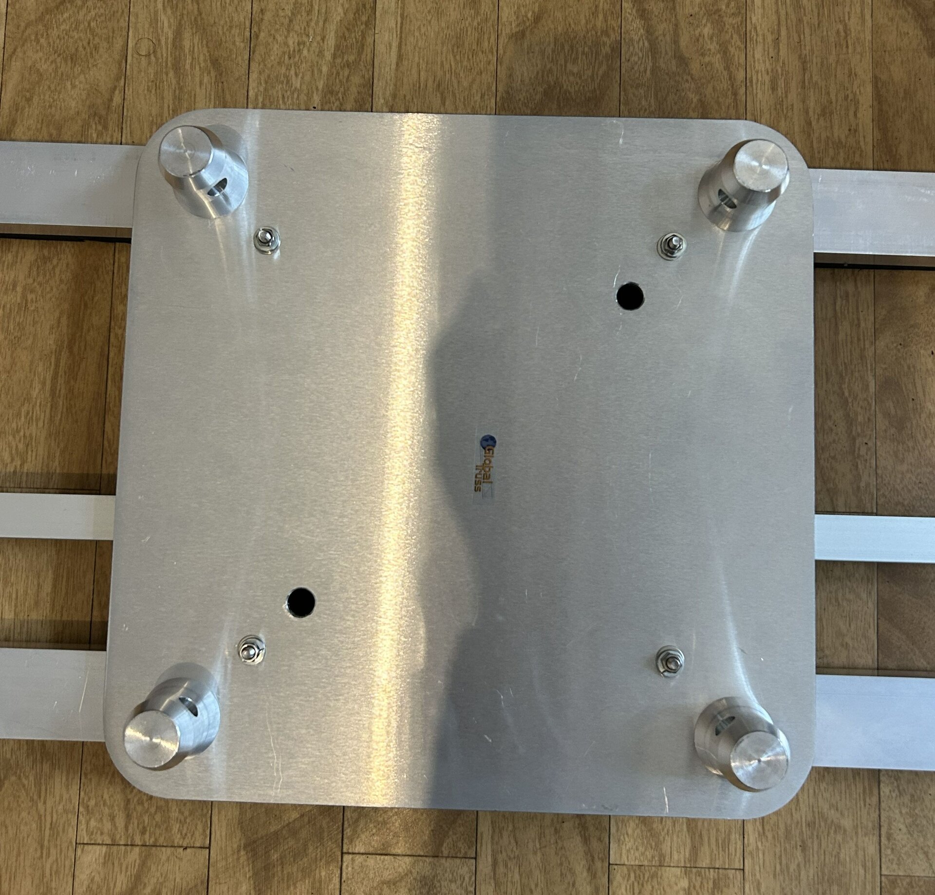 Der Aufbau ist mit wenigen Handgriffen erledigt: Bodenplatte bleibt für den Transport mit den Cones versehen, wird einfach auf den Boden gelegt, Traverse drauf, Plate mit dem Aufbau drauf, für die zweite Auflage die beiden K&M Halter in die Aussparungen der hinteren Strebe gesteckt und fertig.