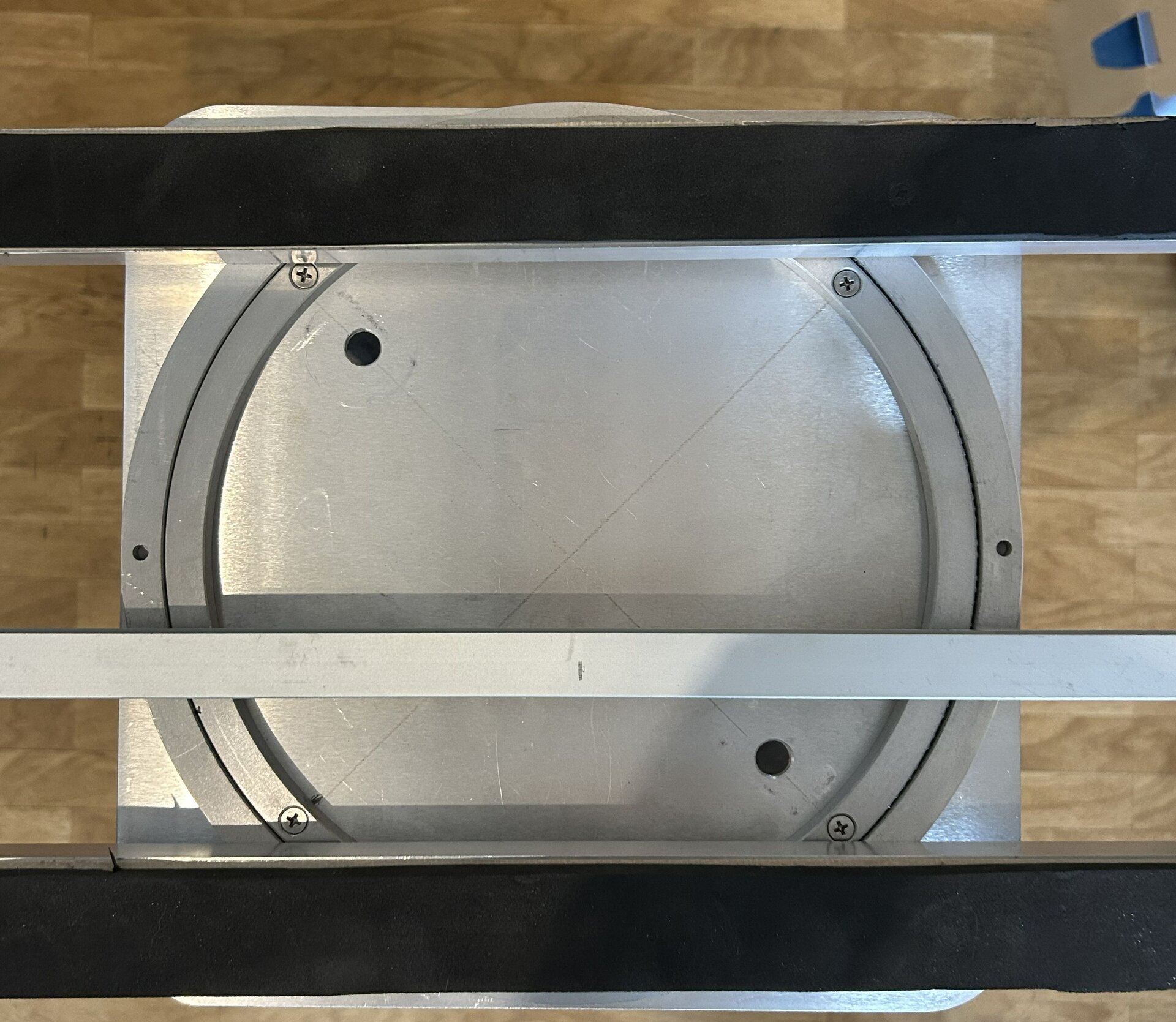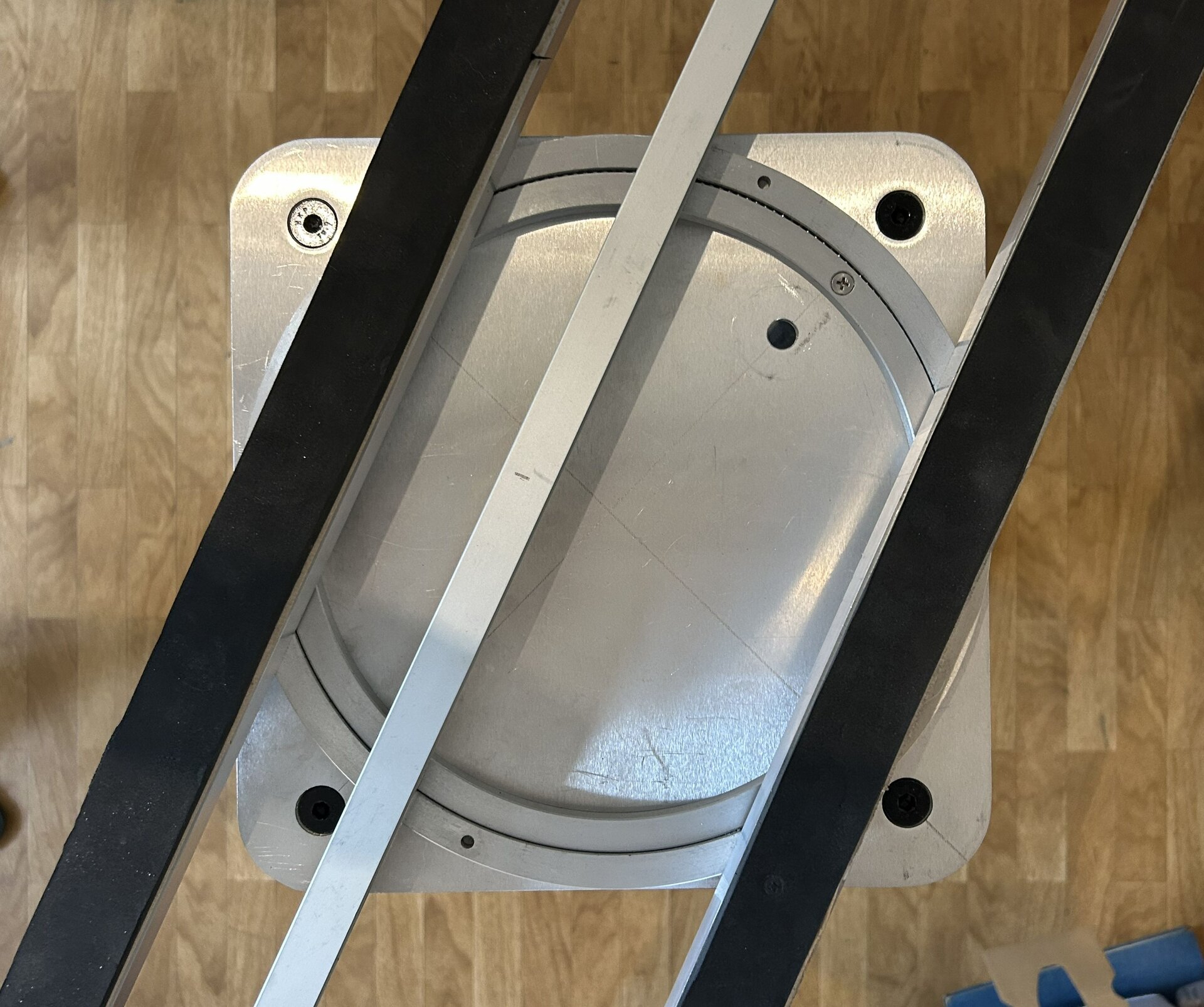 Als erstes muss der Drehteller auf der Baseplate angebracht werden, wofür lediglich vier Bohrungen nötig sind. Bevor er dort befestigt wird, müssen natürlich die Querstreben auf dem Drehteller montiert werden. Dadurch, dass der Drehteller auch aus Aluminium ist, kann man dort einfach die passenden zusätzlichen Bohrungen vornehmen. Allerdings sollte man vor dem Bohren den Schlitz zwischen den Ringen mit Klebeband abdichten, damit keine Splitter in das Kugellager kommen. Die größte Arbeit war die Aussparung für die K&M Arme in der hinteren Aluminum-Strebe.