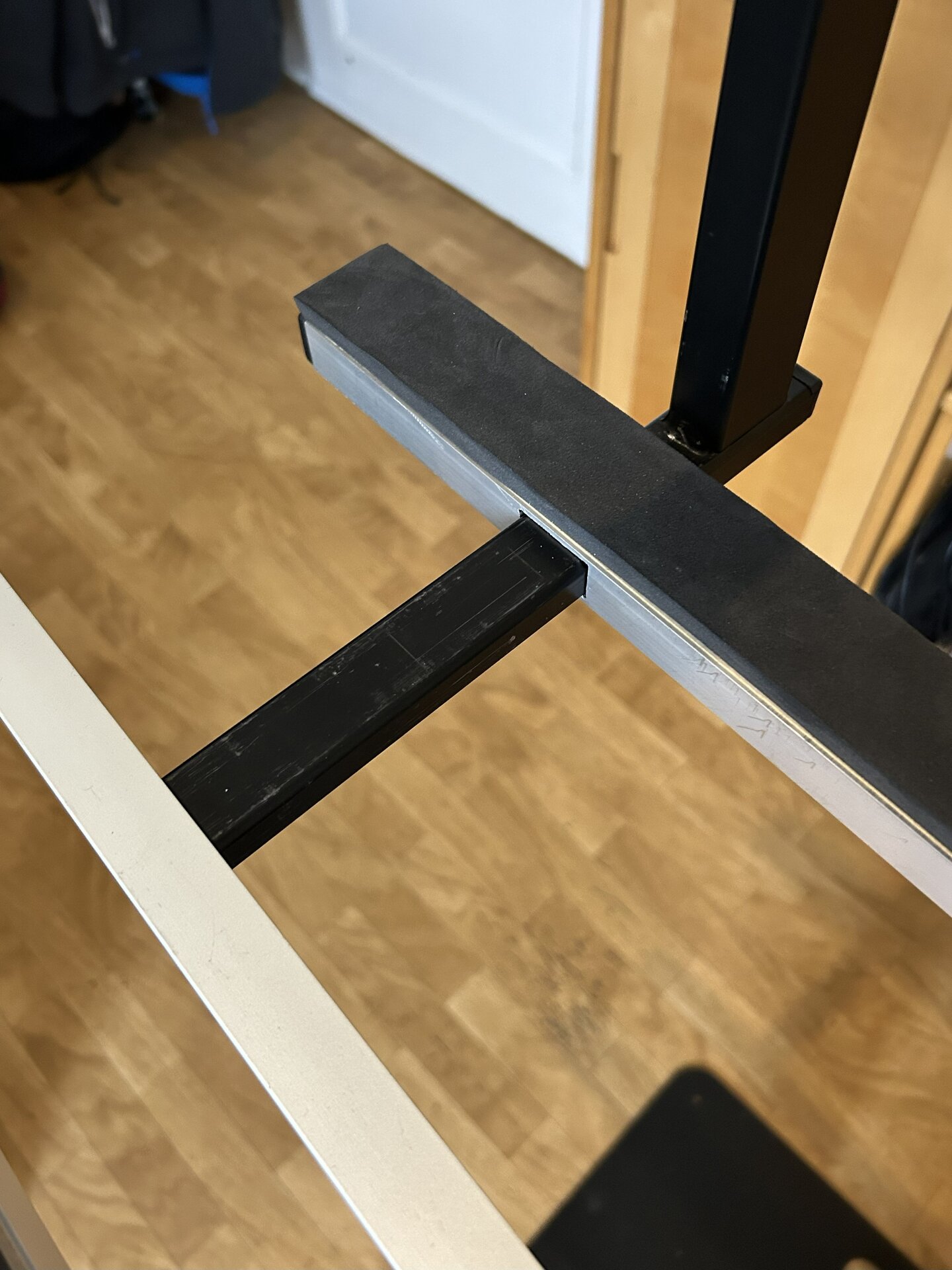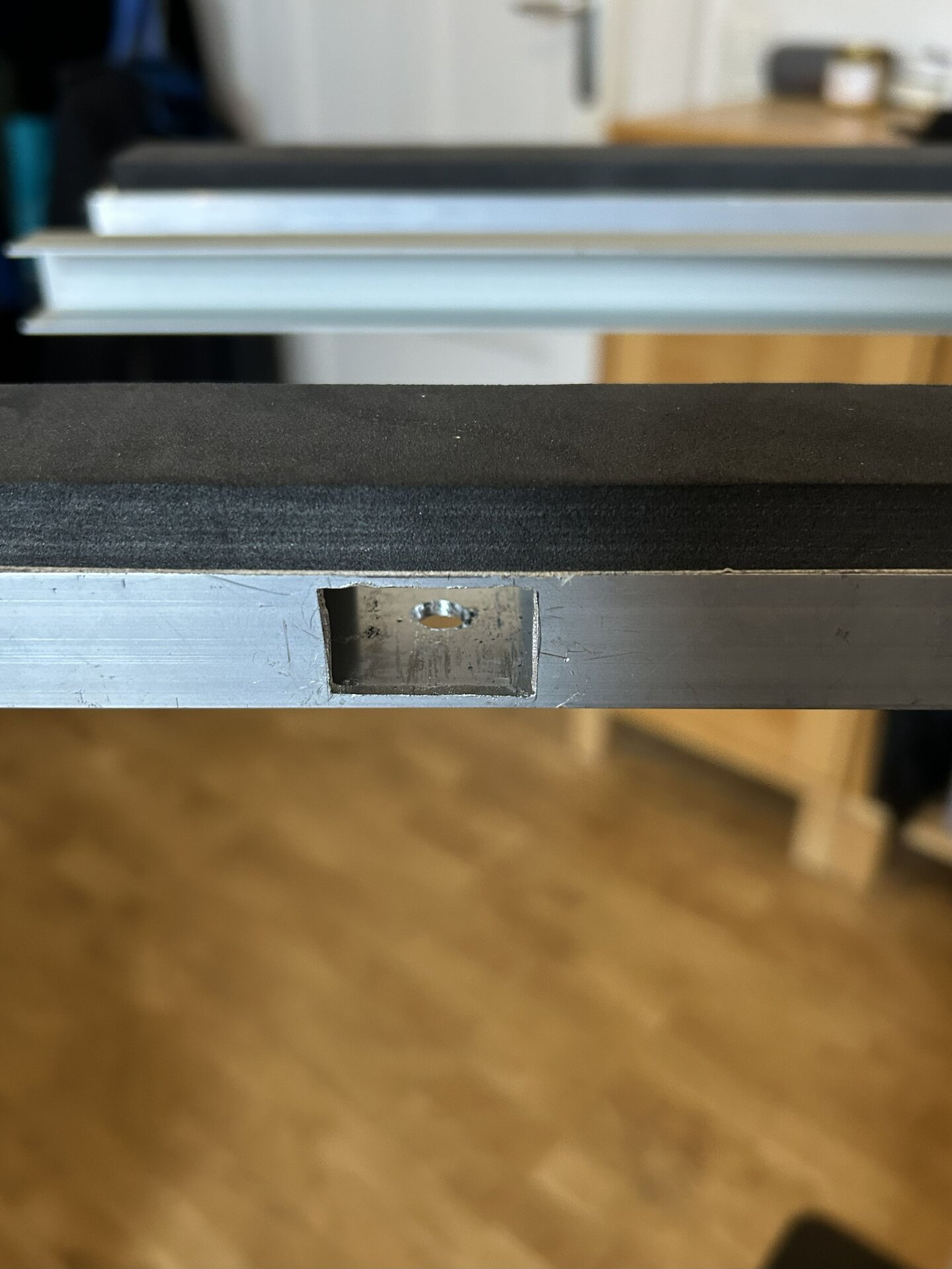 Die Iee mit der Entlastung für die zweiten Arme durch das U-Profil ist zwar prinzipiell gut. Aber die Position war falsch gewählt, da die Arme nicht bis zum Anschlag in das Profil der Querstrebe geschoben werden, sondern mindestens 3cm rausschauen, weil das untere Keyboard sonst zu weit vorne steht. Und dann kommt es auch auf das Keyboard an. Ich bin zwar mit den 3cm im Grunde ok, aber da gibt es im Gegensatz zu meinem PC3K8, das für die Maße hergehalten hat, auch Keyboard, wie mein neues K2700, das leider unten eine andere Auflagefläche hat und gar nicht die hintere Querstrebe berührt. Dafür hab ich dann eine weitere Querstrebe mit größerem Durchmesser genommen, die im Grund dort nur als zusätzliche Auflage liegen muss.