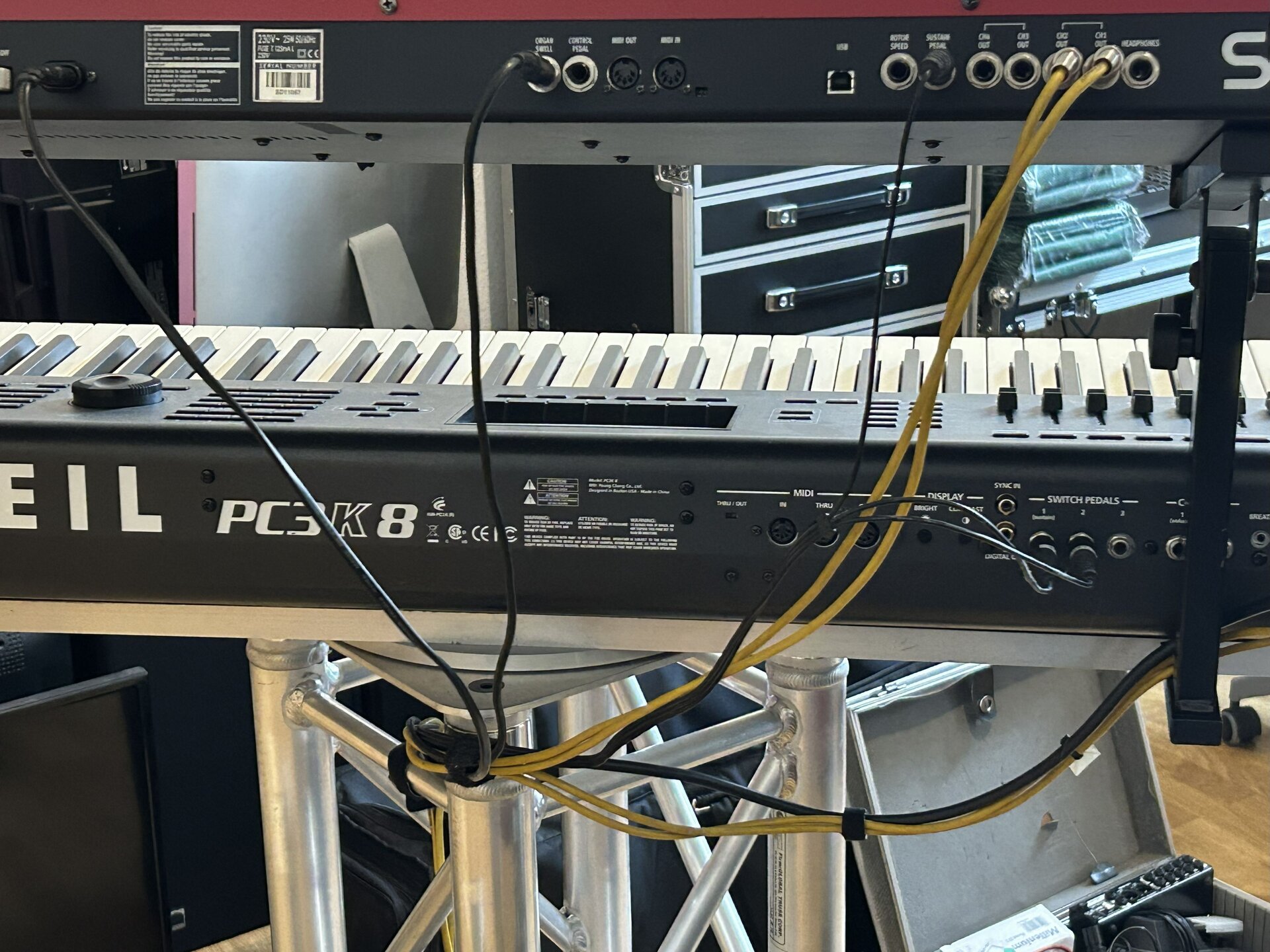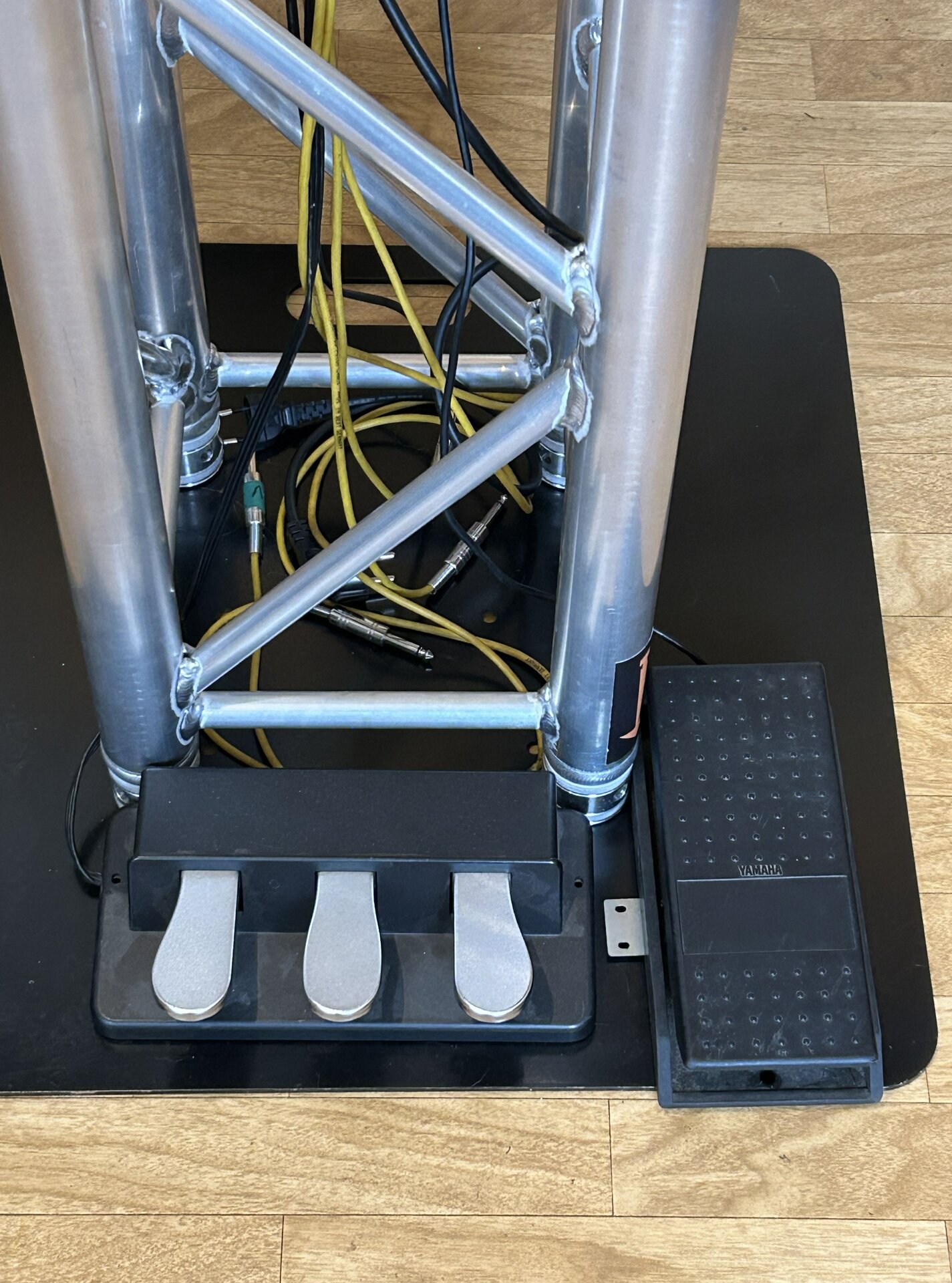 Eine Herausforderung ist dann noch die Verkabelung der Keyboards. Immerhin muss genug Spielraum sein, dass man beim Drehen die Stecker nicht rausreißt oder sich die Kabel verheddern. eine 360° Drehung funktioniert schon mal nicht, das ist klar,. brauche ich auch nicht. Mir reichen 90° nach links oder rechts, und das sollte machbar sein. Außerdem brauche ich noch Sustainpedal und mindestens einen Schweller. Hier ist die Idee, dass man das ggf. auf der Bodenplatte fest verschraubt, evtl. incl. der benötigten Anschlusskabel. Das passende Sustainpedal von M-Audio SP-Triple hatte ich sogar liegen, das genau vor die Traverse passt, weil es nur eine sehr geringe Tiefe besitzt. Ein Yamaha FC7 als passenden Orgel Schweller für das Nord hatte ich auch noch. Die Kabel hab ich für den Testaufbau im inneren der Traverse nach oben geführt, das ist noch nicht formvollendet schön, aber da wird sich noch was finden, wahrscheinlich in Form eines Kabelbaums. Ich bin mir auch noch nicht sicher, ob ich das Keylargo als Sub-Mixer integriere, oder ob ich die Kanäle der Keys einzeln herausführen will.