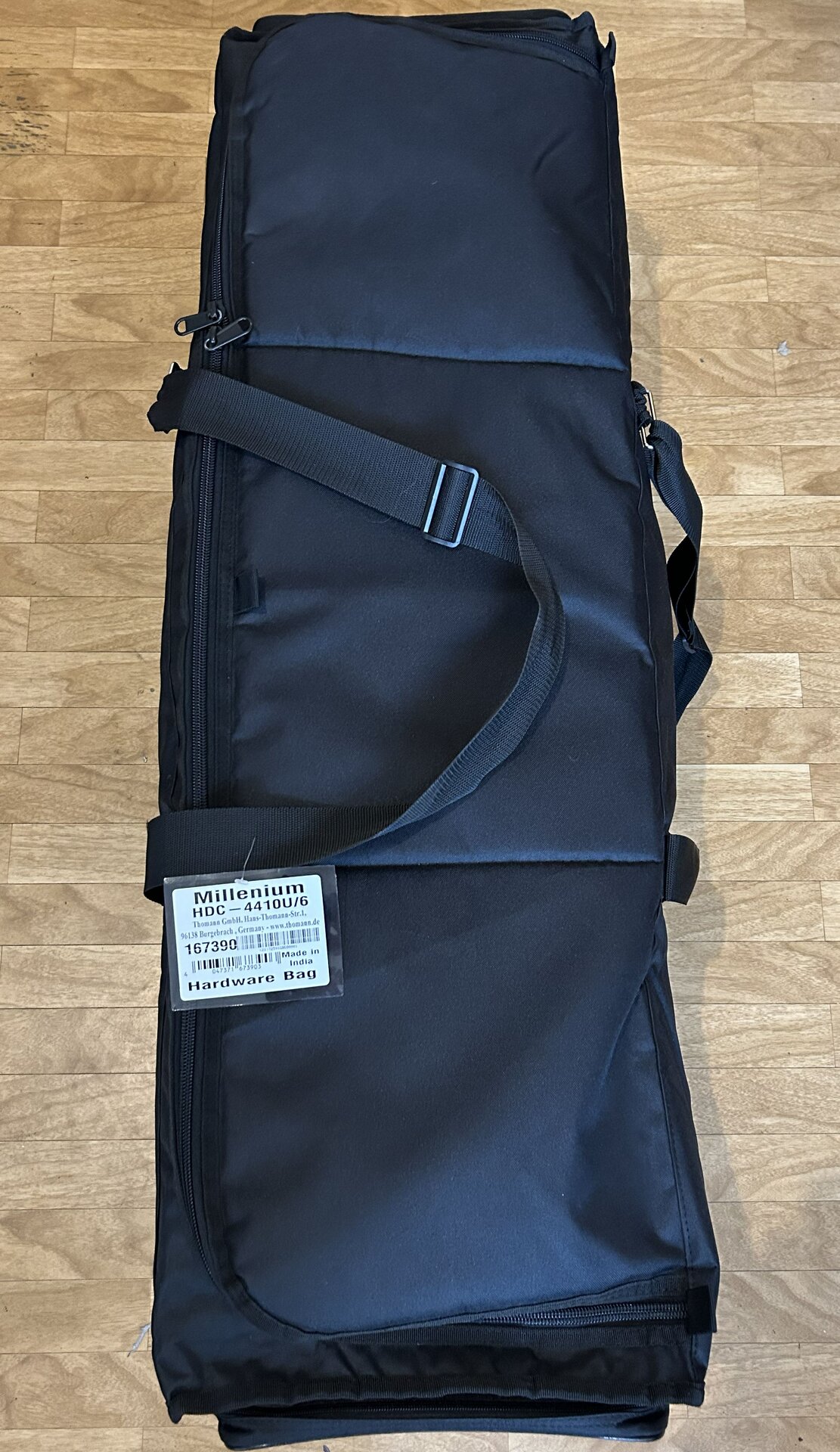 Für den Transport hab ich mir eine passende Tasche geholt, die es beim großen T gab, passt die Traverse rein, die Halter und der Aufbau. Lediglich die Bodenplatte muss ich separat transportieren.