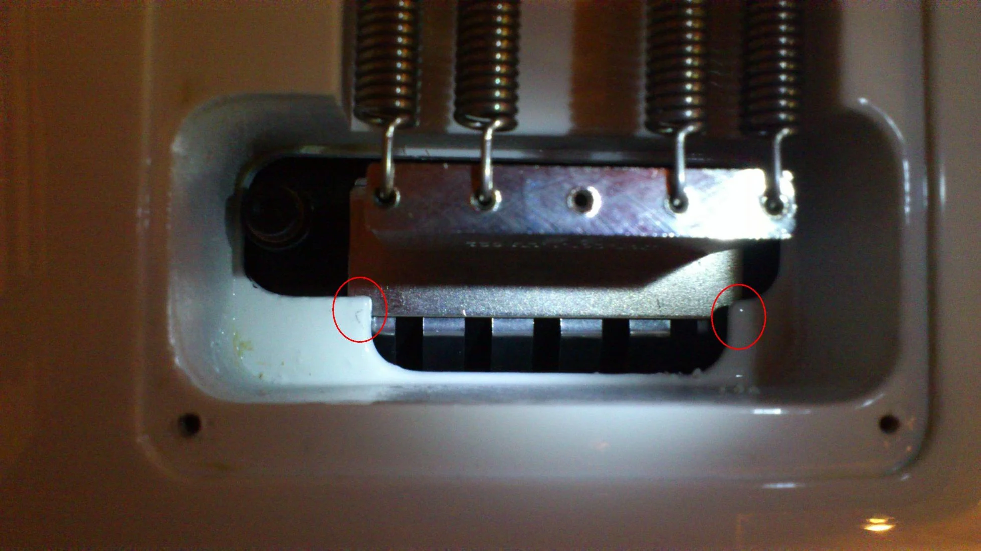 Deswegen habe ich die Abdeckung hinten entfernt um nachzusehen wo es ansteht und meiner Meinung nach ist die Ausfräsung fehlerhaft bzw. für ein anderes Tremolo.