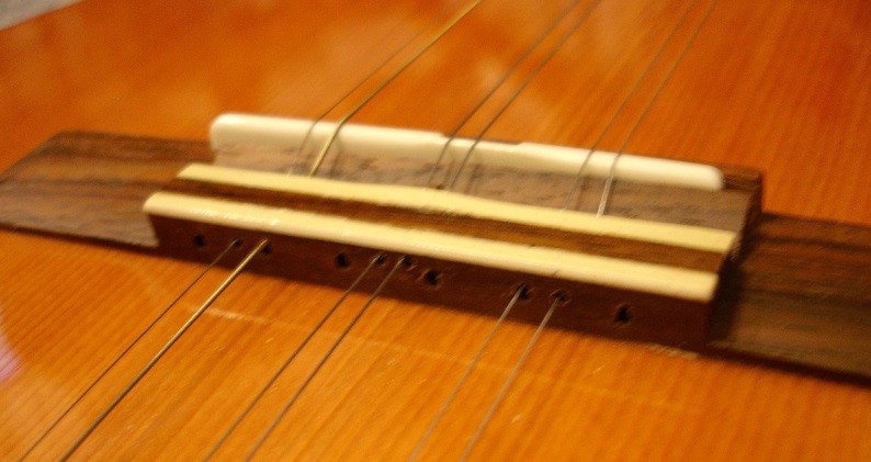 Den Saitenzug habe ich mit einem Saitenhalter an der Zarge abgefangen, die Saiten gehen beim Steg nur durch. Damit muss der Steg den Zug nicht aufnehmen.