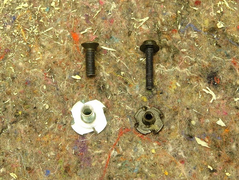 Der Pfennig dient nur als Fixpunkt zum Scharfstellen für die Kamera. Der Griff ist mittels Einschlaghülsen verschraubt. Also schraube ich den Griff ab und hebele die Einschlaghülsen mit einem schmalen Schraubendreher vorsichtig heraus. Das geht kinderleicht. Die Löcher werden mit einem passenden, in Ponal getränkten Holzdübel verschlossen. Außen wird der Dübel gerade so weit vorstehen (hier kann man mit einem leichten Hammerschlag auf den Dübel sehr gut arbeiten, dazu nutze ich einen Schusterhammer mit gewölbter Bahn), so dass ein späterer Flecken Tolex keine Beule bildet: