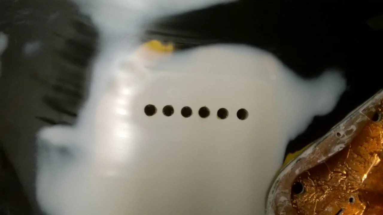 Bin irgendwie etwas angepisst. Trotz Standbormaschine sind die Löcher für die Saiten nich so schön geworden. Der kleine 3,5mm Bohrer ist etwas verlaufen.