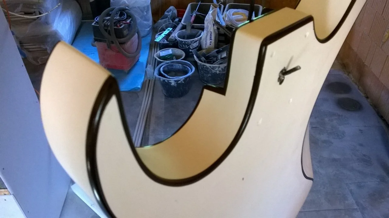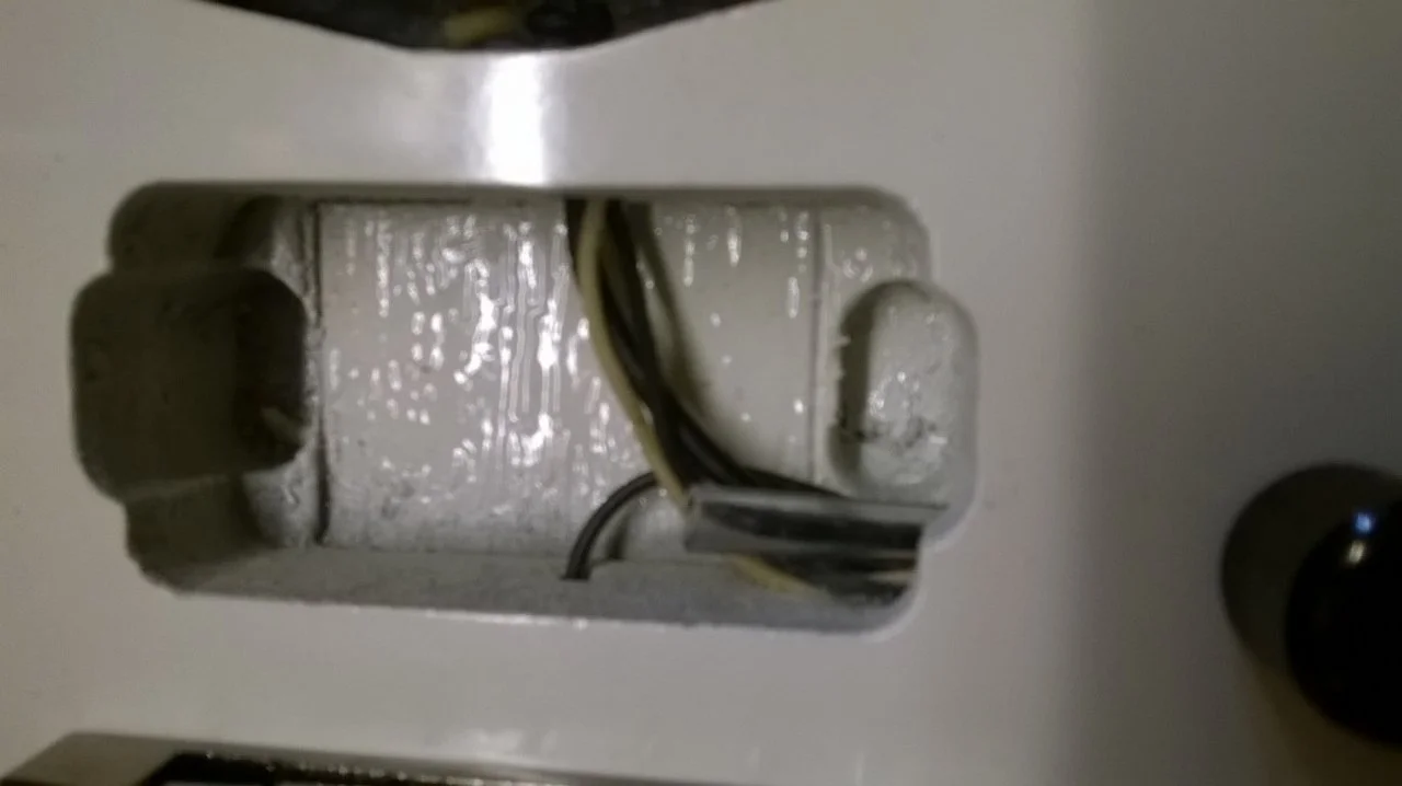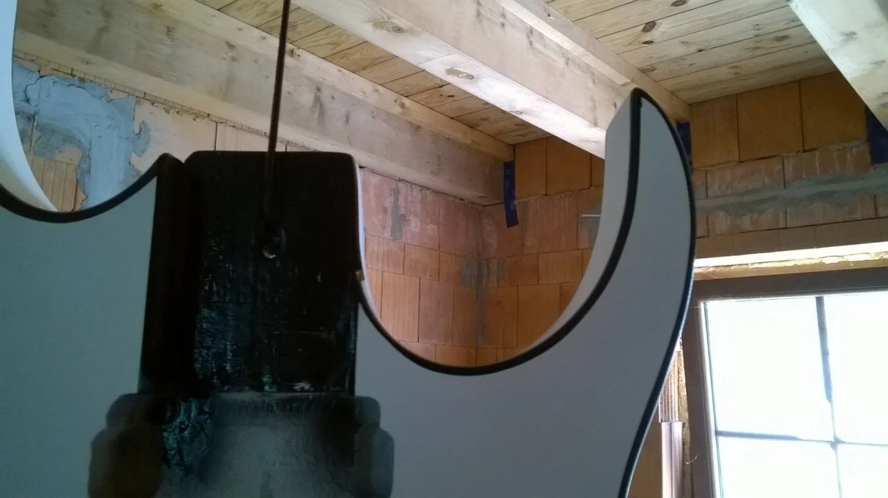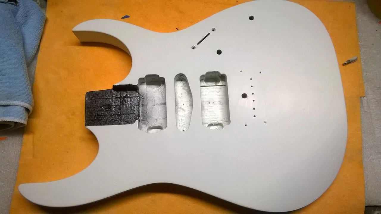 Ich habe mit einem kleinen HBohrer und Kombizange durch die Kabellöcher der Tonabnehmerausfräsungen ein Stück weiter Richtung Brücke gebohrt. Diese Bohrung ist auf die hier sichtbare gestoßen.