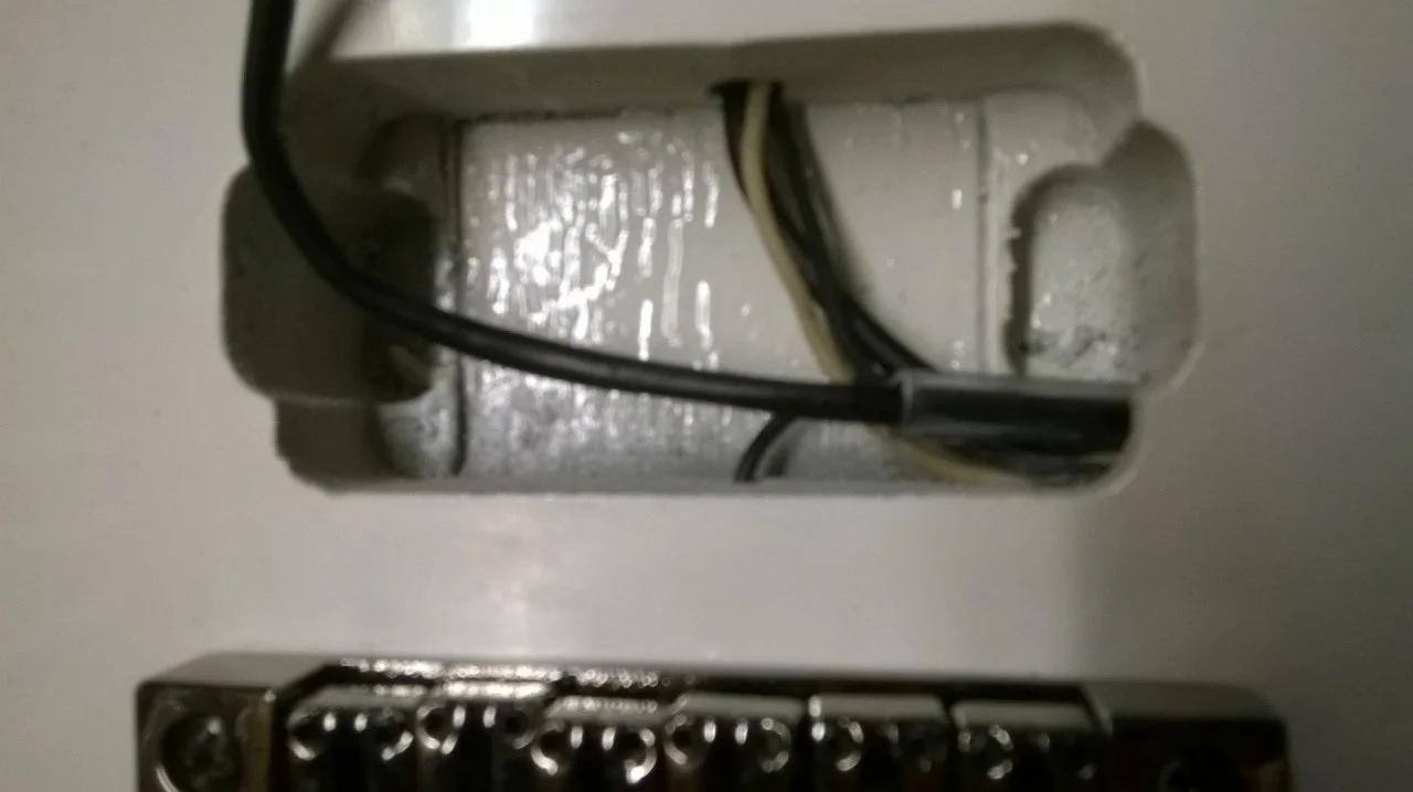 Was mir wohl ewig ein Rätsel bleiben wird warum Dimarzio solche dünnen Klingeldrähte verwendet. Bei der Montage des PU's an der Brücke hatte ich etwas Mühe die Leitungen durch die Bohrung zu bekommen. Lag ja auch schon genug drin.