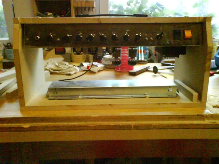 Hab noch ein Gehäuse rumstehen. War der erste Prototyp und entsprach nicht ganz meinen erwartungen. War 1cm zu breit und hatte Kanten, die mir beim Beziehen Schwierigkeiten gemacht hätten. Kann es dir vielleicht zum Selbstkostenpreis überlassen, wenn der Sovereign reinpaßt. Statt Tolex kann man es auch einfach lackieren. Ist schon komplett abgeschliffen und die Kanten abgerundet. Tragegriff (der garantiert hält) gibts auch noch mit dazu.