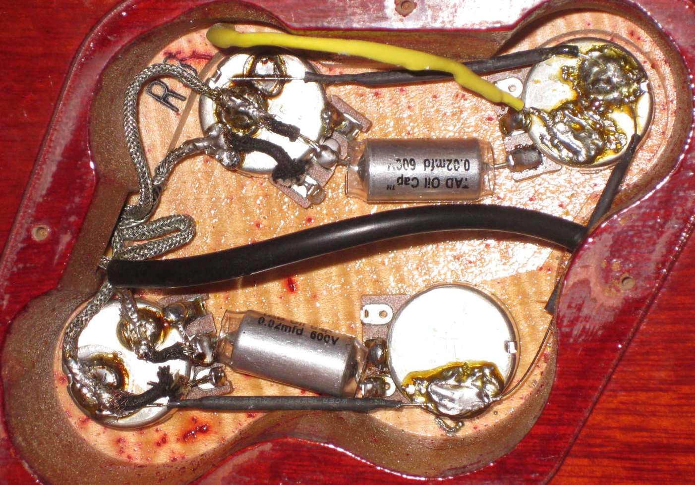 Habe die beiden Volume Potis neu eingebaut! Die Tone Potis waren (hoffentlich: sind ;-)) ja okay. Dann noch die neuen TAD Kondensatoren.