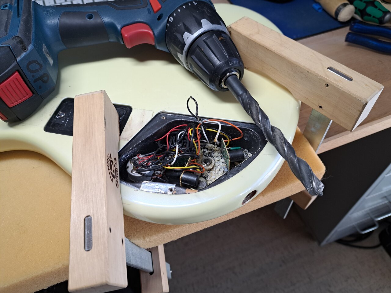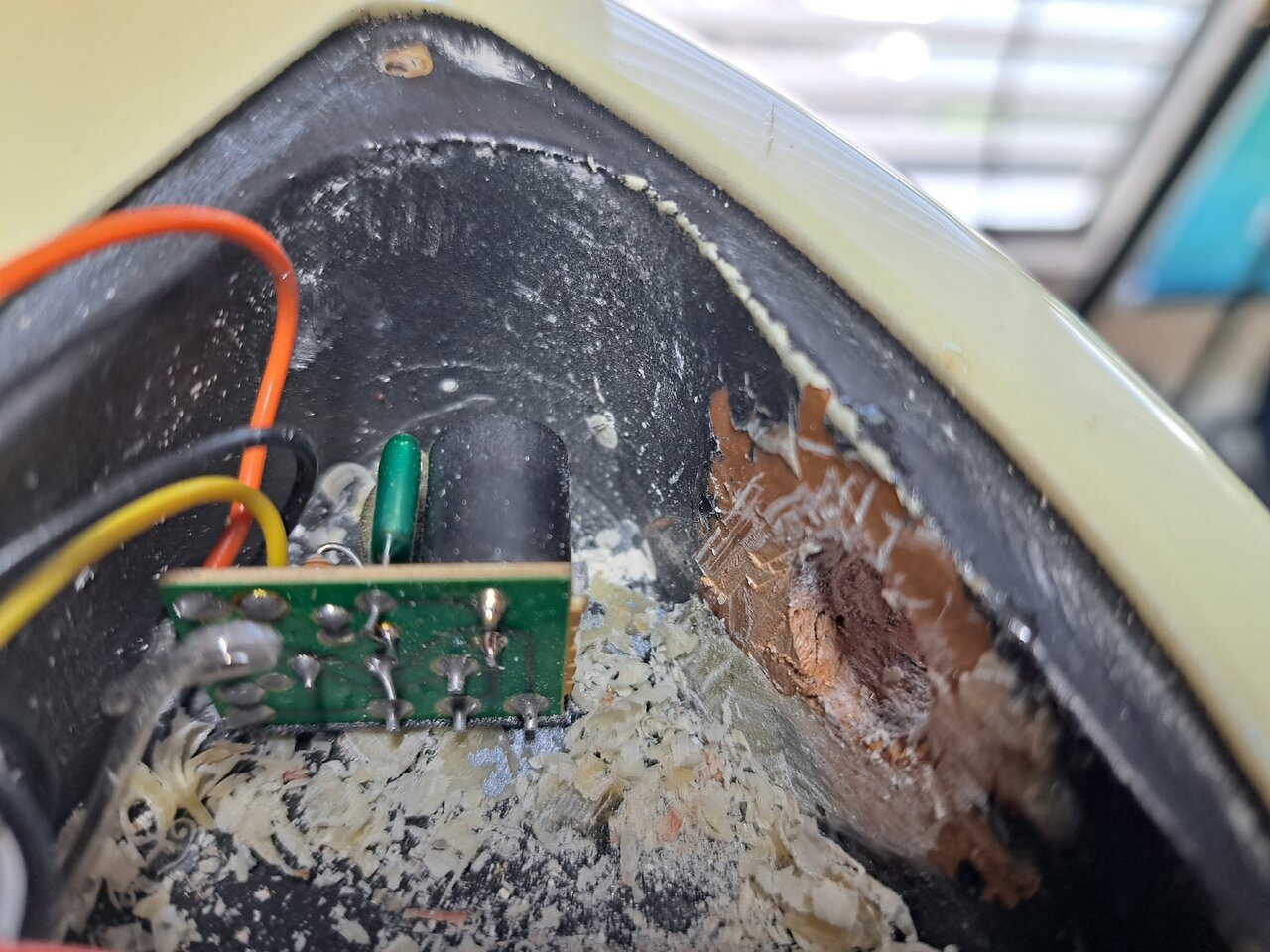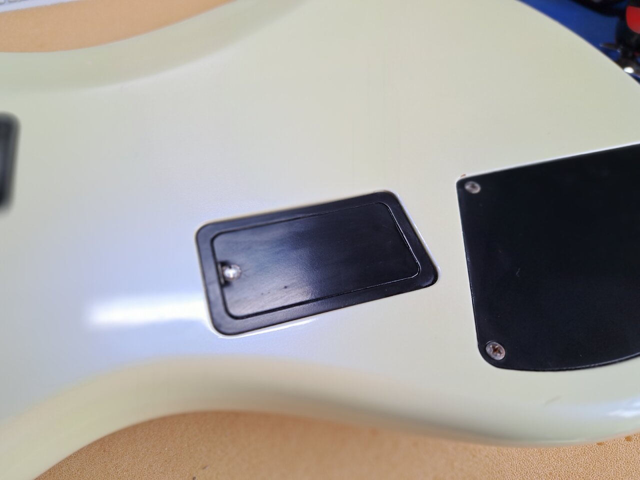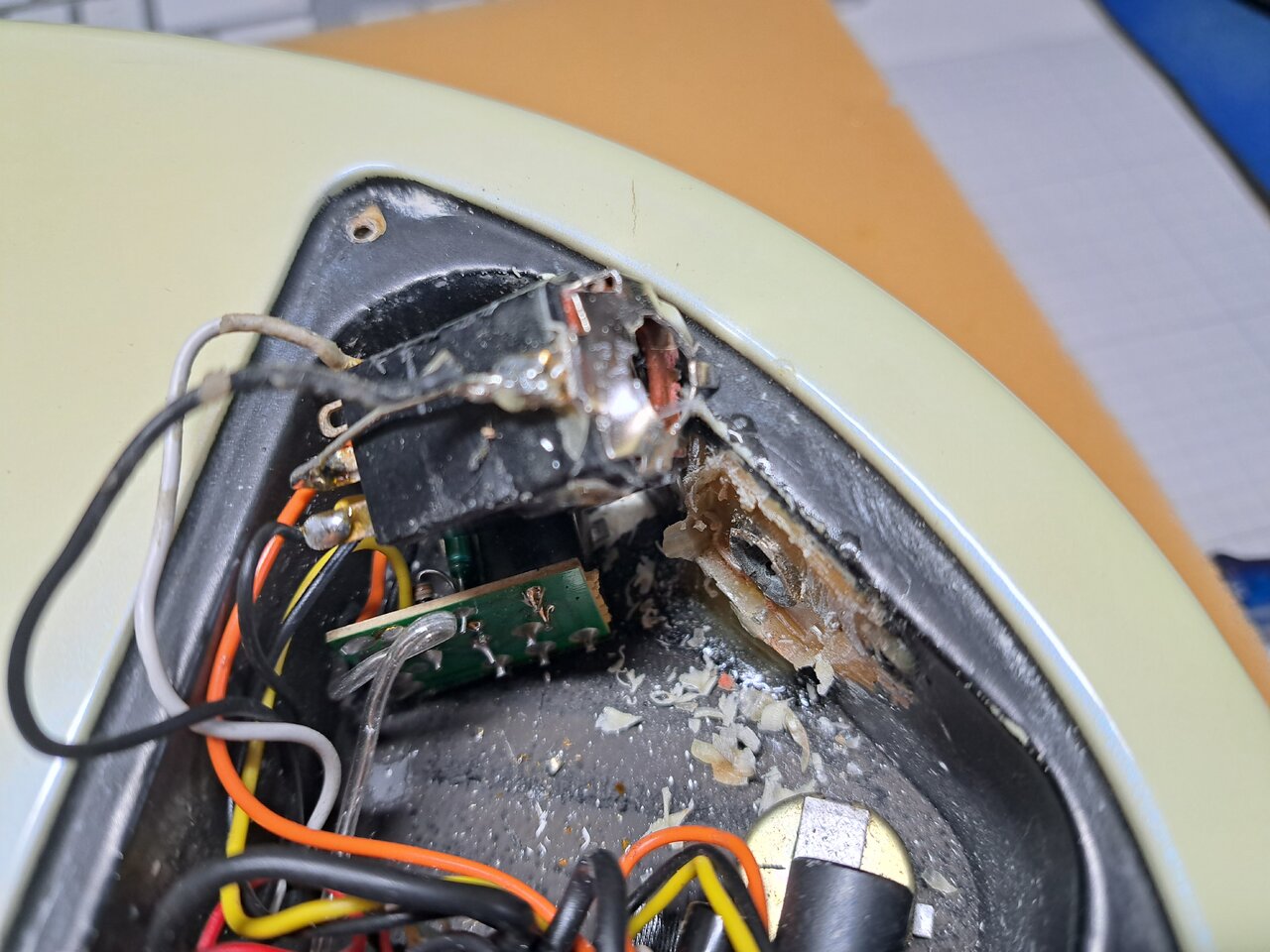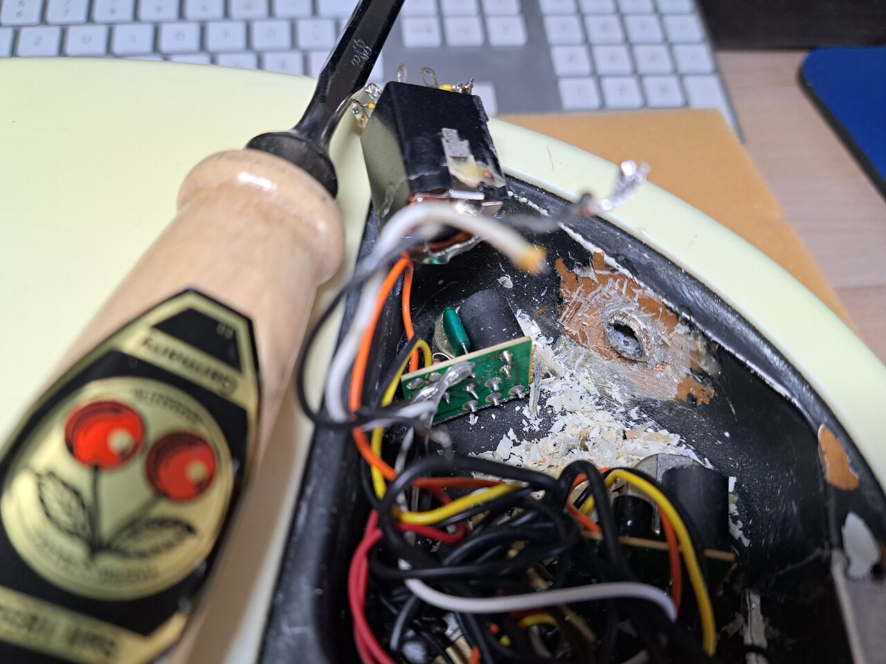 Der äußere Zustand war ganz OK, das Instrument wurde zwar viel gespielt, aber auch einigermaßen gut gepflegt. Etwas Korrosion an der Brücke und den Potiknöpfen ist vorhanden, Lackprobleme oder Holzschäden sind für mich keine feststellbar, dafür war das Batteriefach defekt (Schraube herausgefallen, provisorisch mit einem Stück Textilklebeband verschlossen) und - was sich noch als hartnäckiger Störenfried herausstellte - eine dubiose Klinkenbuchse anstelle der werksseitig verbauten Zargenbuchse war vorhanden. Der Zugang war ca. 2cm nach innen versetzt, meine Standard-Neutrik-Stecker wollten nicht reinpassen, nur mit einem Patchkabel mit sehr dünnem Klinkenstecker konnte ich einen Funktionstest machen.