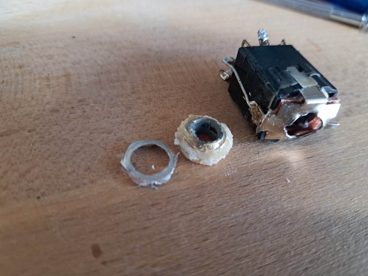 Eine völlig falsche Klinkenbuchse - vermutlich als improvisierte Alternative, weil man die röhrenförmigen Zargenbuchsen damals nicht an jeder Ecke kriegen konnte - wurde mit einem sehr festen Klebstoff (Zwei-Komponenten-Kleber?) ins E-Fach gepappt.