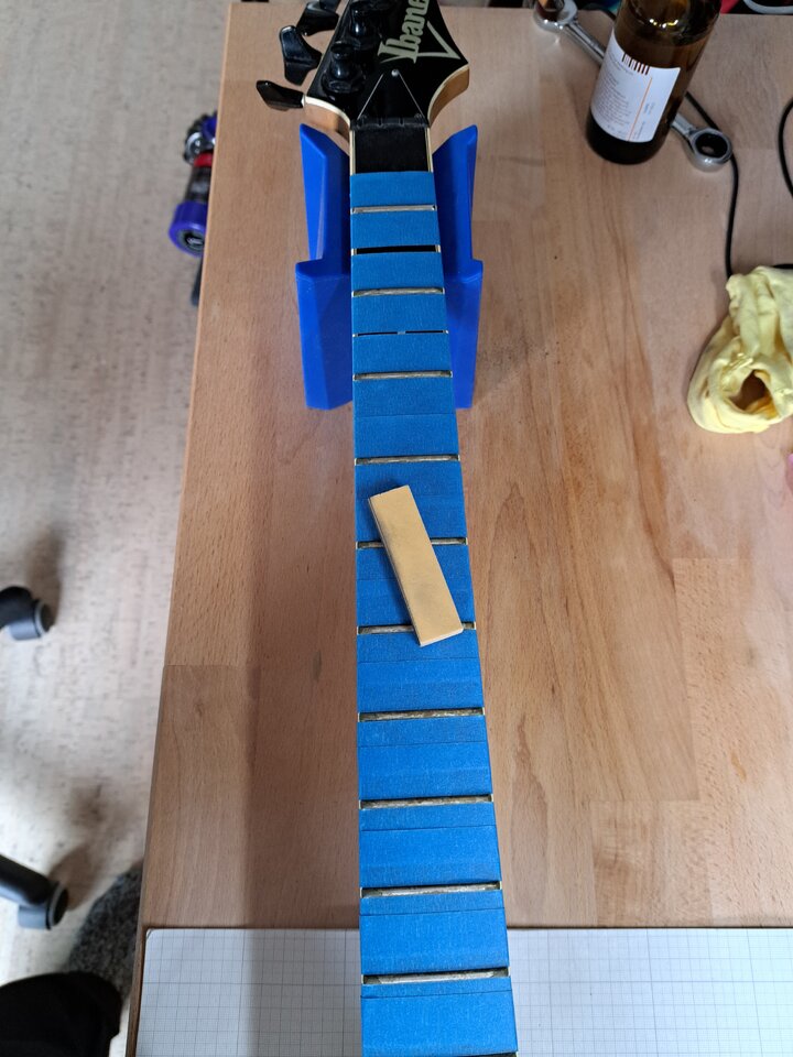 Dann kam das Griffbrett an die Reihe, erst einmal die Bundstäbchen. Die hatten es bitter nötig, aber die Verkrustungen ließen sich mit dem Hosco Fret Polishing Rubber gut entfernen, vorsichtshalber hatte ich das Holz mit Flachkrepp abgeklebt.