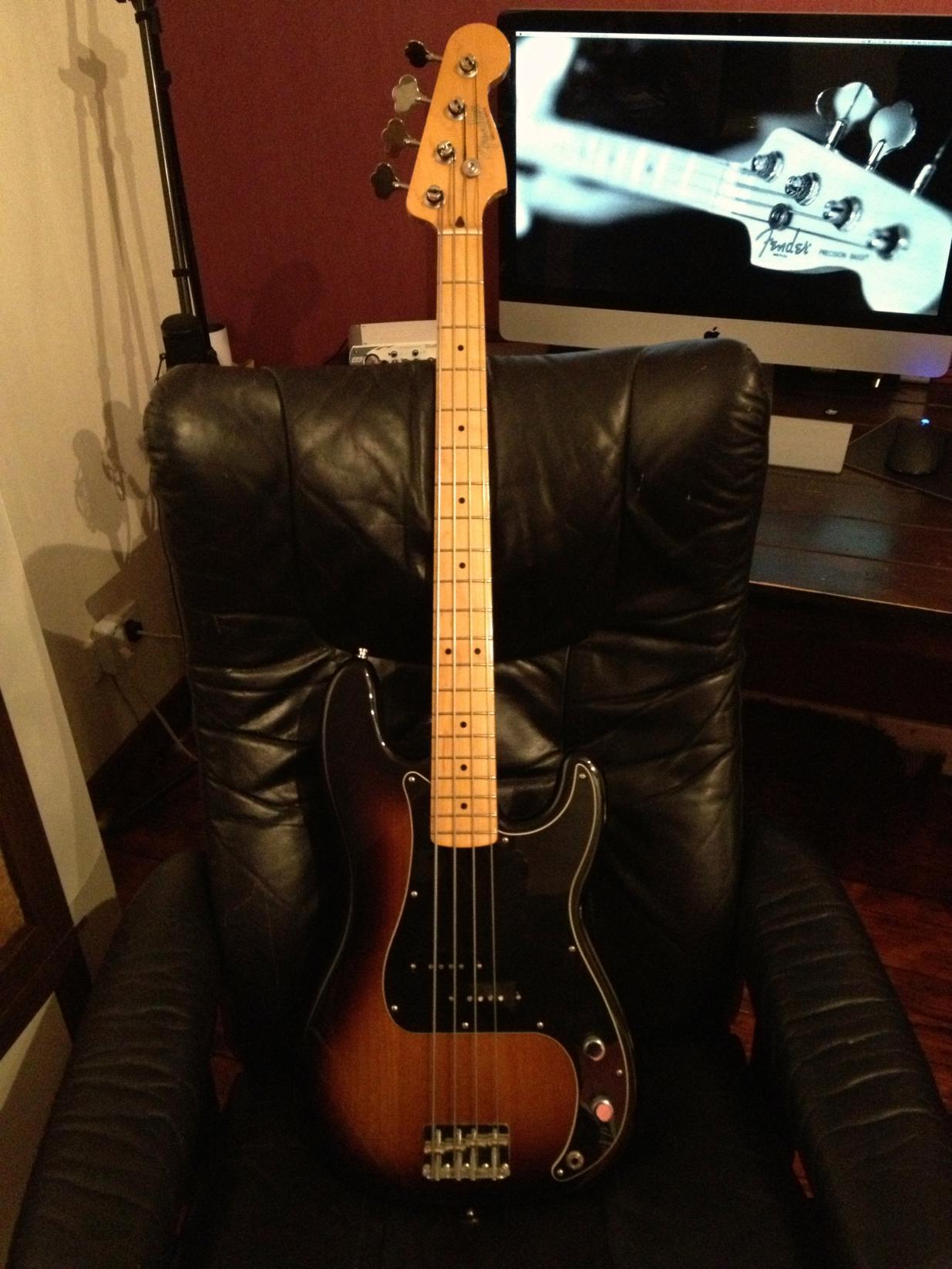 So, ich glaub ich hatte ja schonmal meinen Preci hier gezeigt, aber kann ja nichts schaden. Habe nun neben dem schwarzen Pickguard die Fender CS Vintage PUs eingebaut und La Bella Deep Talking 760FS Flats aufgezogen (haben die Chromes ECB82 ersetzt). Hals wurde nun nochmal minimal angepasst. Saitenlage ist nun nochmal ein ganzes Stück runter gekommen, Sound einfach nur vom feinsten. Jetzt bin ich absolut zufrieden mit dem Teil.