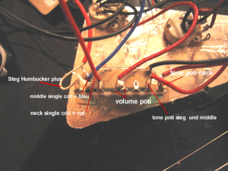Ein Plan, der mir zum Beispiel sagt, welche Lötlasche vom Volumepoti zum Tonpoti, welche Kabel von welchem Humbucker sonstwohim gebraten werden müssen, wäre echt `ne geile Maßnahme.