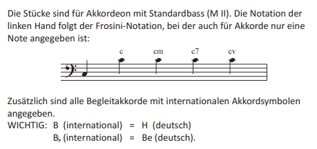 Hier werden die Akkorde ebenfalls mit einer Note gekennzeichnet. Was ja für Standardbass-Akkordeon Sinn macht, da die Akkorde vom Hersteller festgelegt werden. Man hat eh keine Möglichkeit einen Umkehrung zu spielen. Also reicht es, wenn man für die Akkorde nur EINEN Ton angibt. Die "normale" Schreibweise ist sinnlos und macht das Vom-Blatt-Spiel deutlich schwerer.