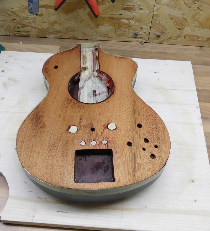 Während des Trocknens des Schnellschleifgrunds wollte ich mich weiter um die Pickupaufnahme kümmern. Der PU wird Mithilfe der mitgelieferten Schrauben mit dem Plexiglasdeckel verbunden. Dieses Konstrukt dann mit einer tiefer sitzenden Holzscheibe, die innen am Schalloch anliegt und beim Drehen für Stabilität sorgt. Diese Scheibe wiederum wird per Einschlaghülse und Mutter, sowie einem Bolzen mit der goldenen Schraubhülse aussen am Korpus verbunden. So zumindest ist es der Plan.