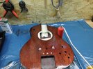 Nachdem die Rückseite des Korpus satt eingerollt wurde, habe ich sie in den Heizungskeller zum Trocknen gelegt. Dort ist es zwar nicht deutlich wärmer als sonstwo, aber ich wollte die Ausgasungen nicht permanent an meiner Werkbank haben.