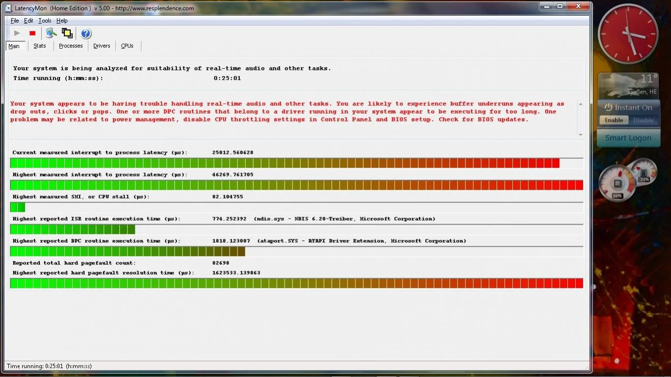 Your system appears to be having trouble handling real-time audio and other tasks. You are likely to experience buffer underruns appearing as drop outs, clicks or pops. One or more DPC routines that belong to a driver running in your system appear to be executing for too long. One problem may be related to power management, disable CPU throttling settings in Control Panel and BIOS setup. Check for BIOS updates.