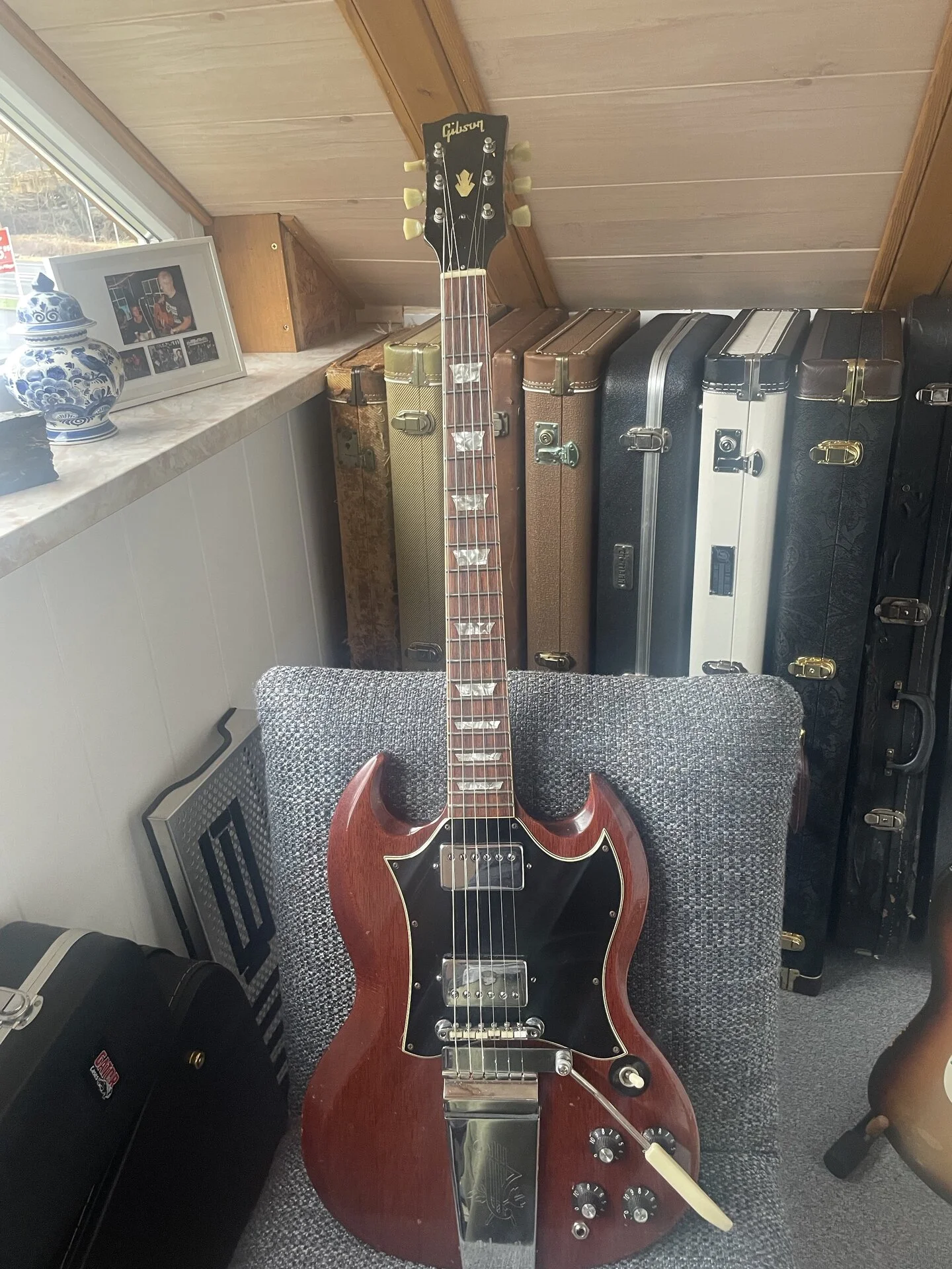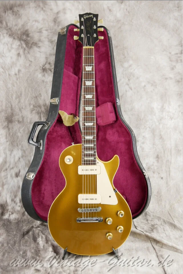 Bis auf die Lackierung und Wraparound Brücke komplett original. Das Teil hat augenscheinlich ein bewegtes Leben hinter sich und war zu einem Zeitpunkt komplett weiss angestrichen (Plastikteile wie Jackplate, Trussrod Cover, Pickguard, Sattel, etc.). Das wurde dann irgendwann verschlimmbessert und die arme Gitarre in Kackbraun gefärbt und stümperhaft lackiert. Die originalen Mechaniken waren zwar im Koffer, die Knöpfe waren aber am Zerbröseln.