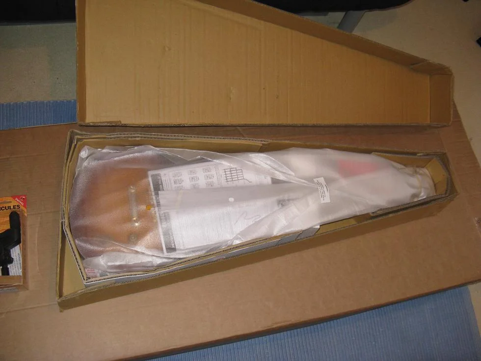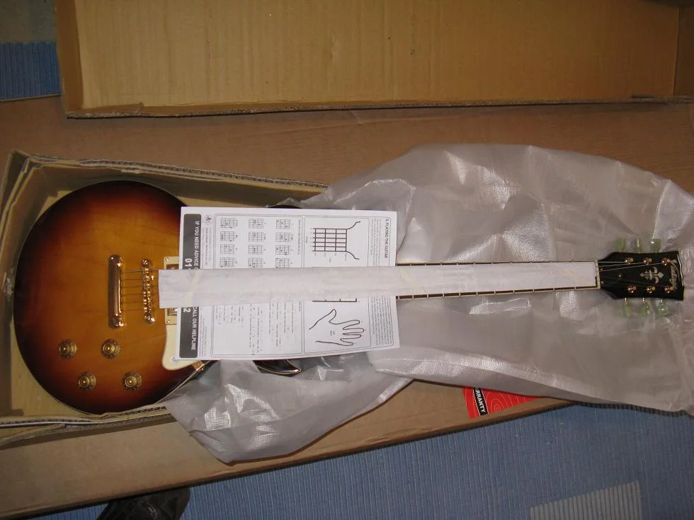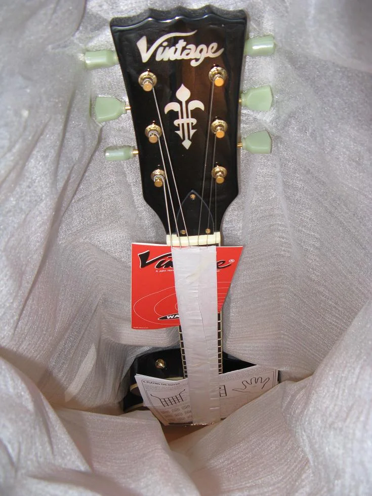 Der bestellte Wandhalter war übrigens auch drin; neben der üppigen Schutzfüllung aus geshredderter Kartonage kam aber die ersehnte Gitarrenverpackung zum Vorschein. Vintage-Karton freigelegt. Alles sauber aufgebahrt.