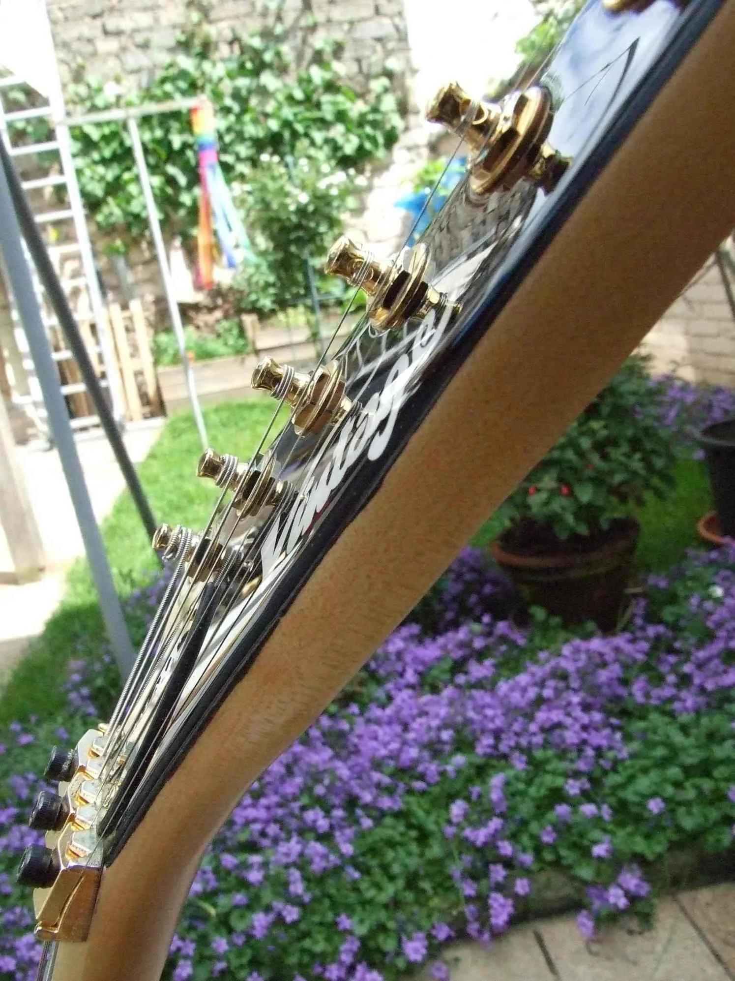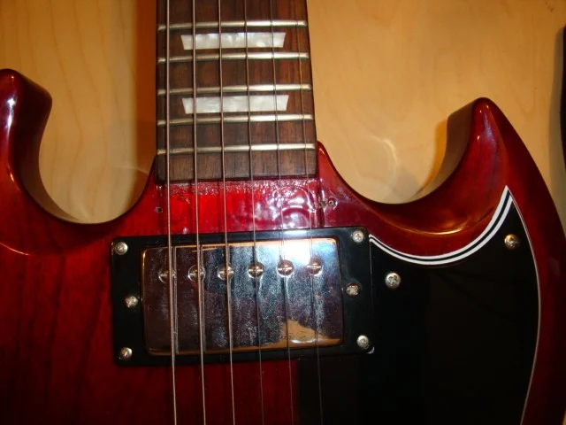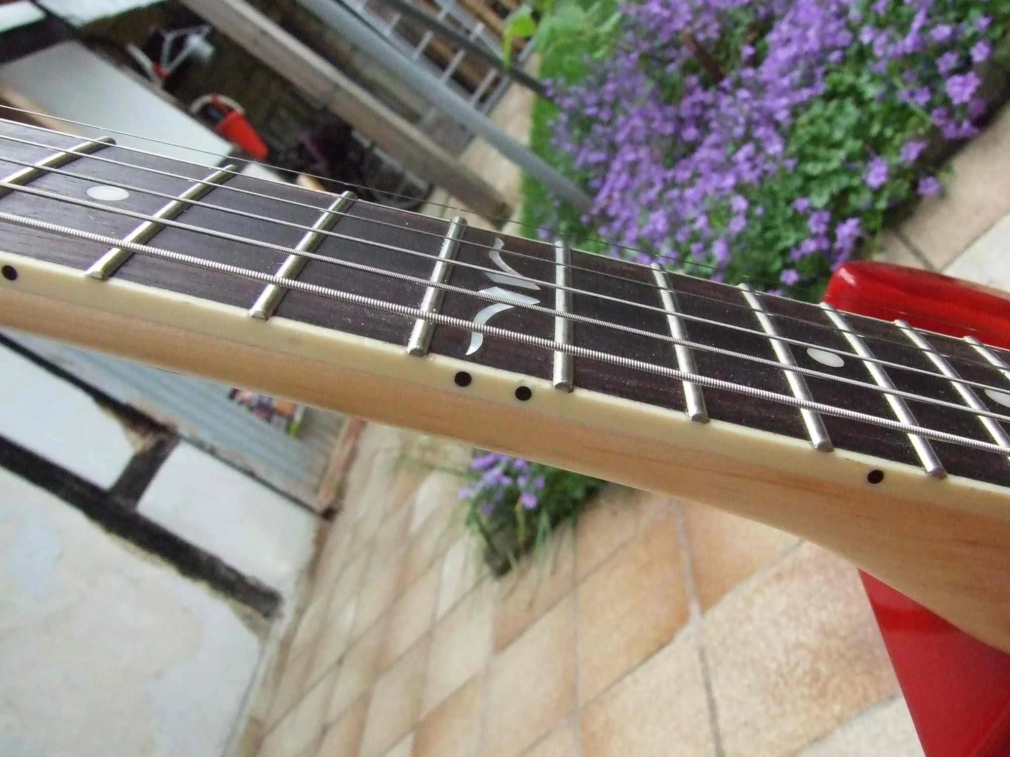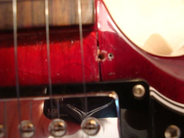 Da sehe ich plötzlich, dass der Hals auf der einen Seite nicht bündig mit dem Body eingepasst ist - da ist ein ca 1mm breiter Spalt.