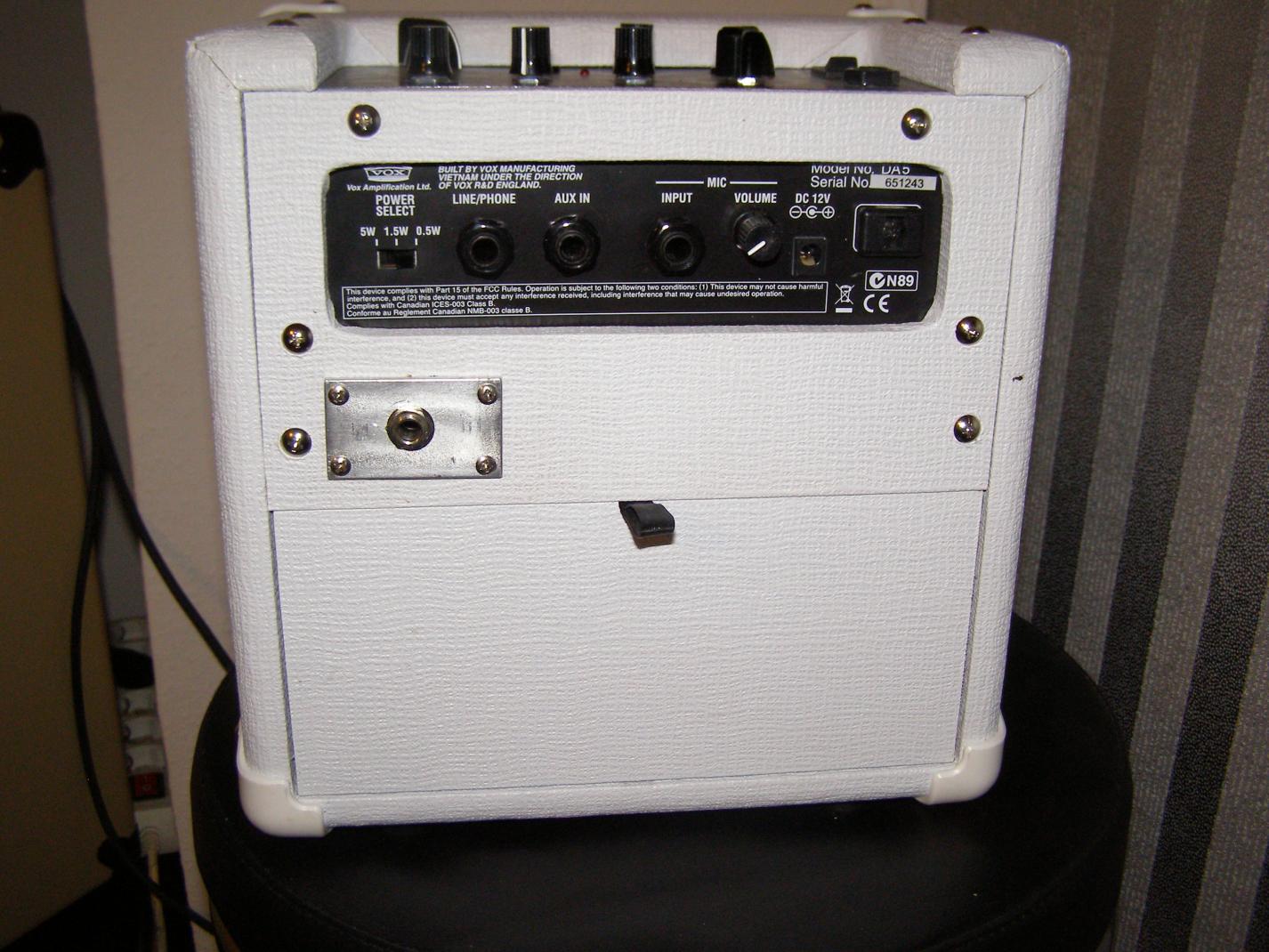 Der Headphone out ist jetzt eine 3,5mm Klinke auf der Oberseite, auf der Rückseite ein Anschluß für ein Pedal und der Powerregler mit dem man von 15 Watt auf Zimmerlautstärke regeln kann.