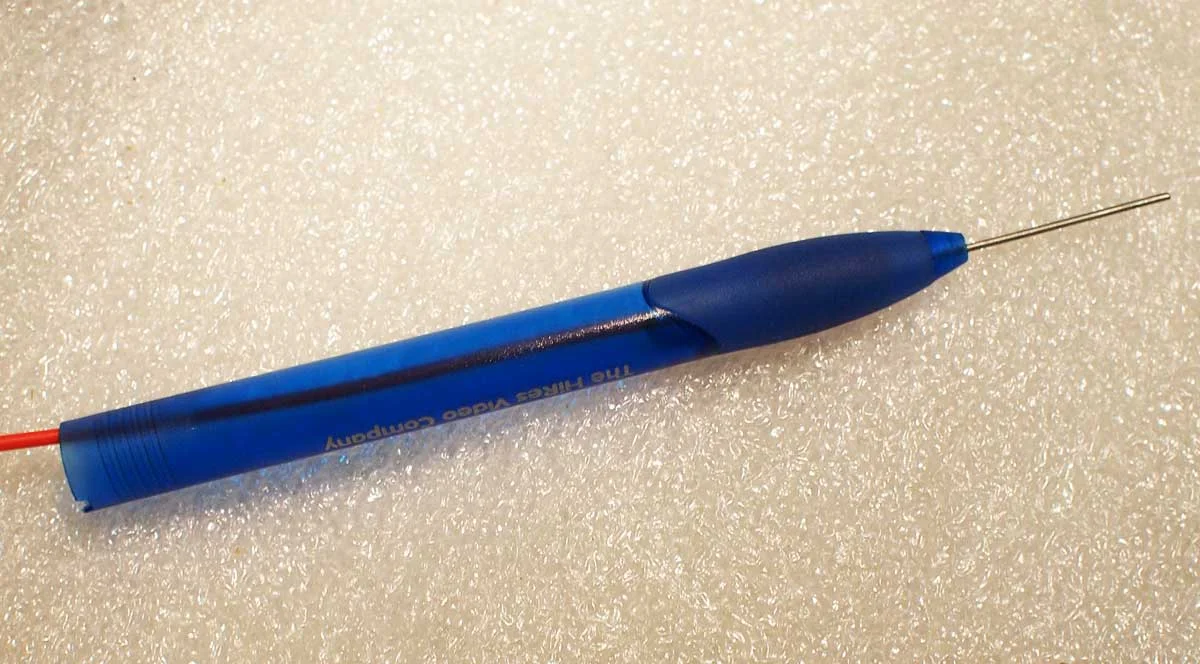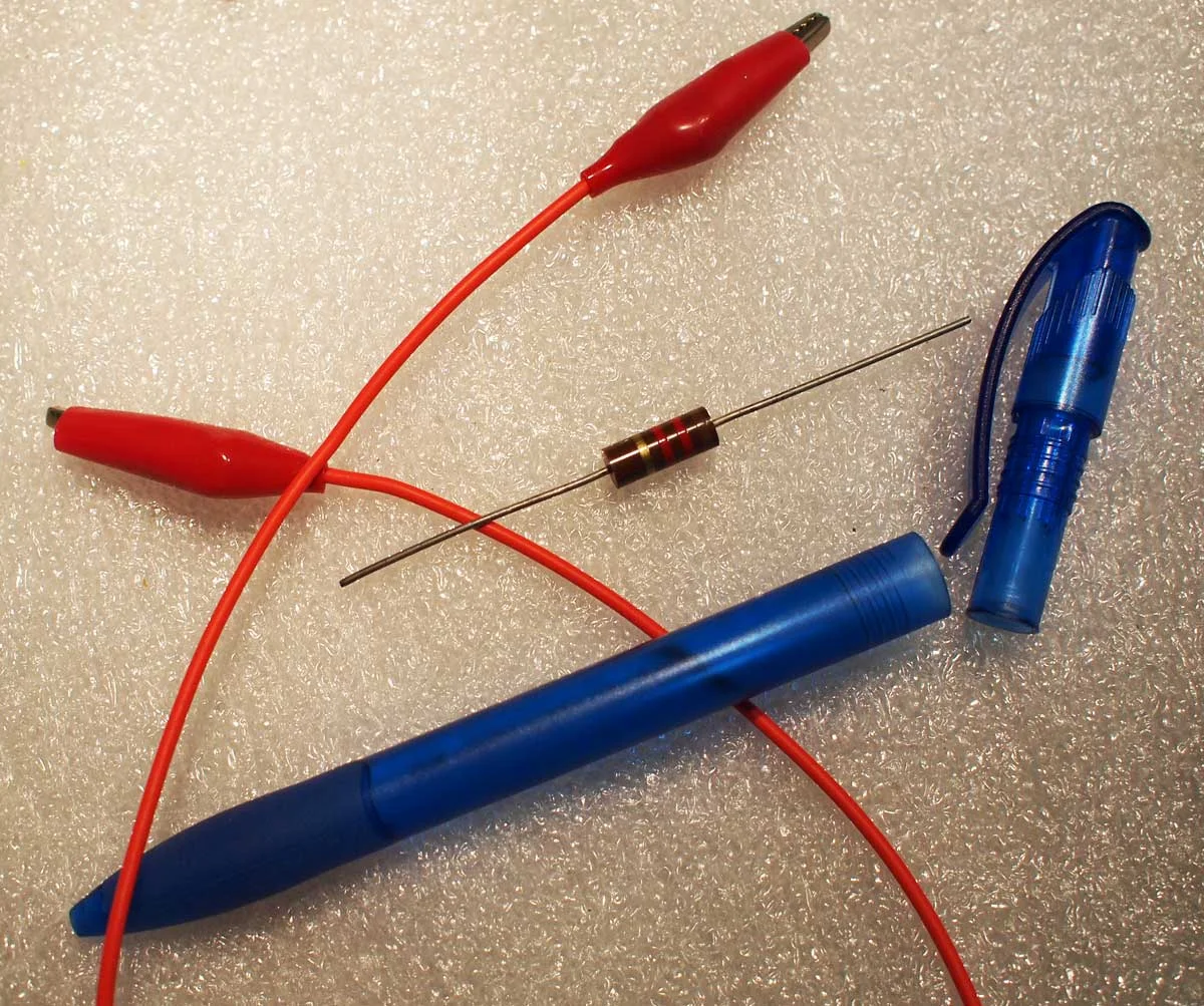 Den Widerstand in das untere Teil des Kugelschreibers stecken, so dass ein Drahtende unten 'rausschaut: