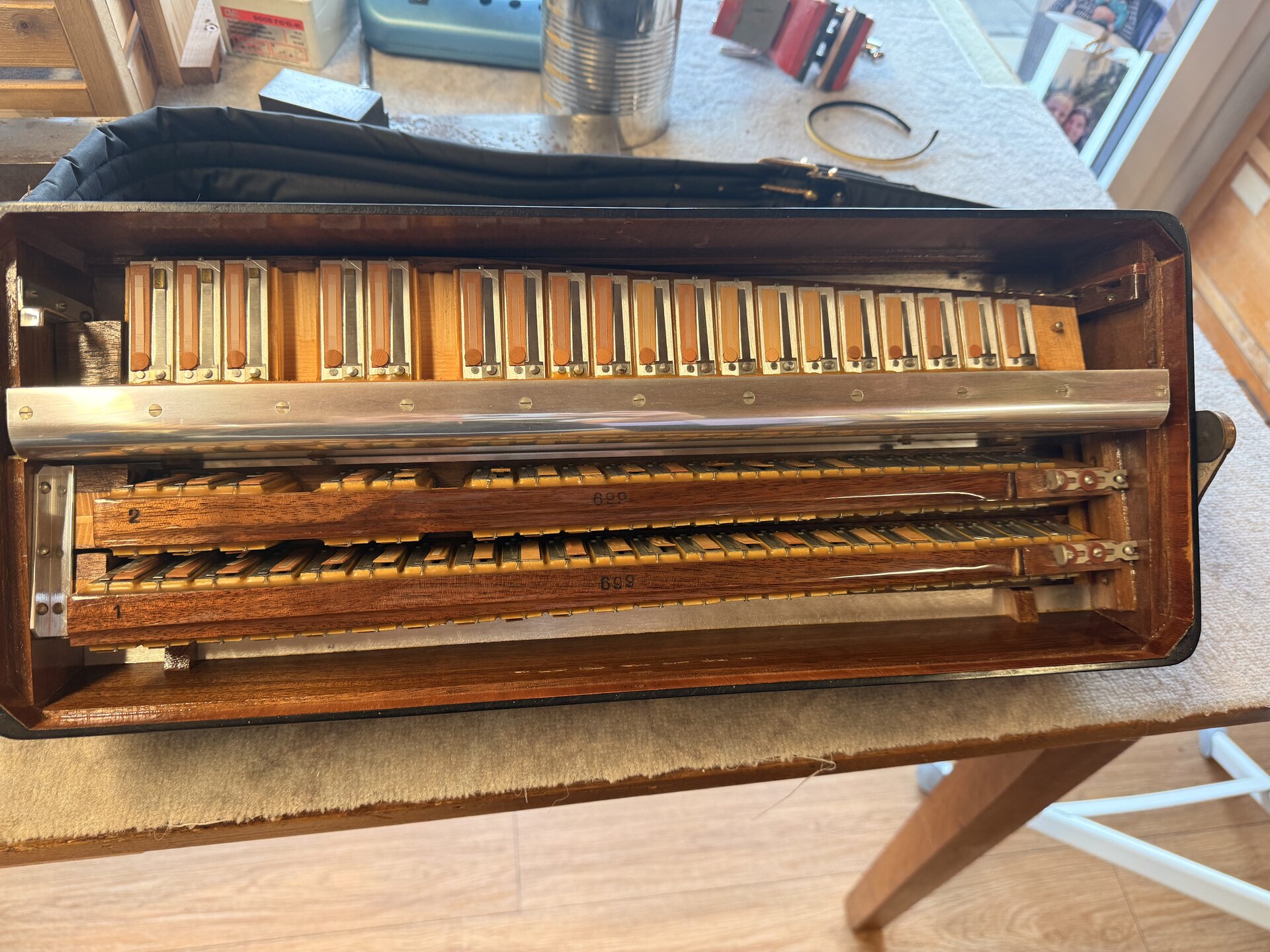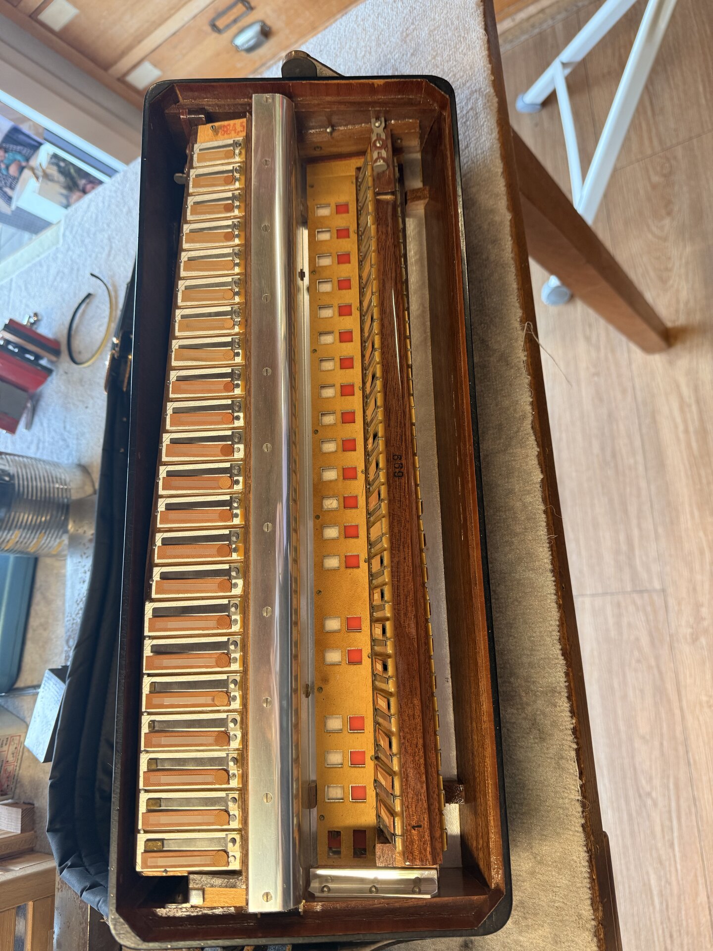 es ist die 699 ... da passt die Bauform eher dazu .. die 966 müsste so grob um 1970 gebaut worden sein.. und da waren ein paar bauliche Details bereits anders.Ich denke ich werde mich erstmal bei Hohner erkundigen ob die 699 bzw. die 669 (je nachdem wie die Zahl liegt …) irgendwo vermerkt ist.