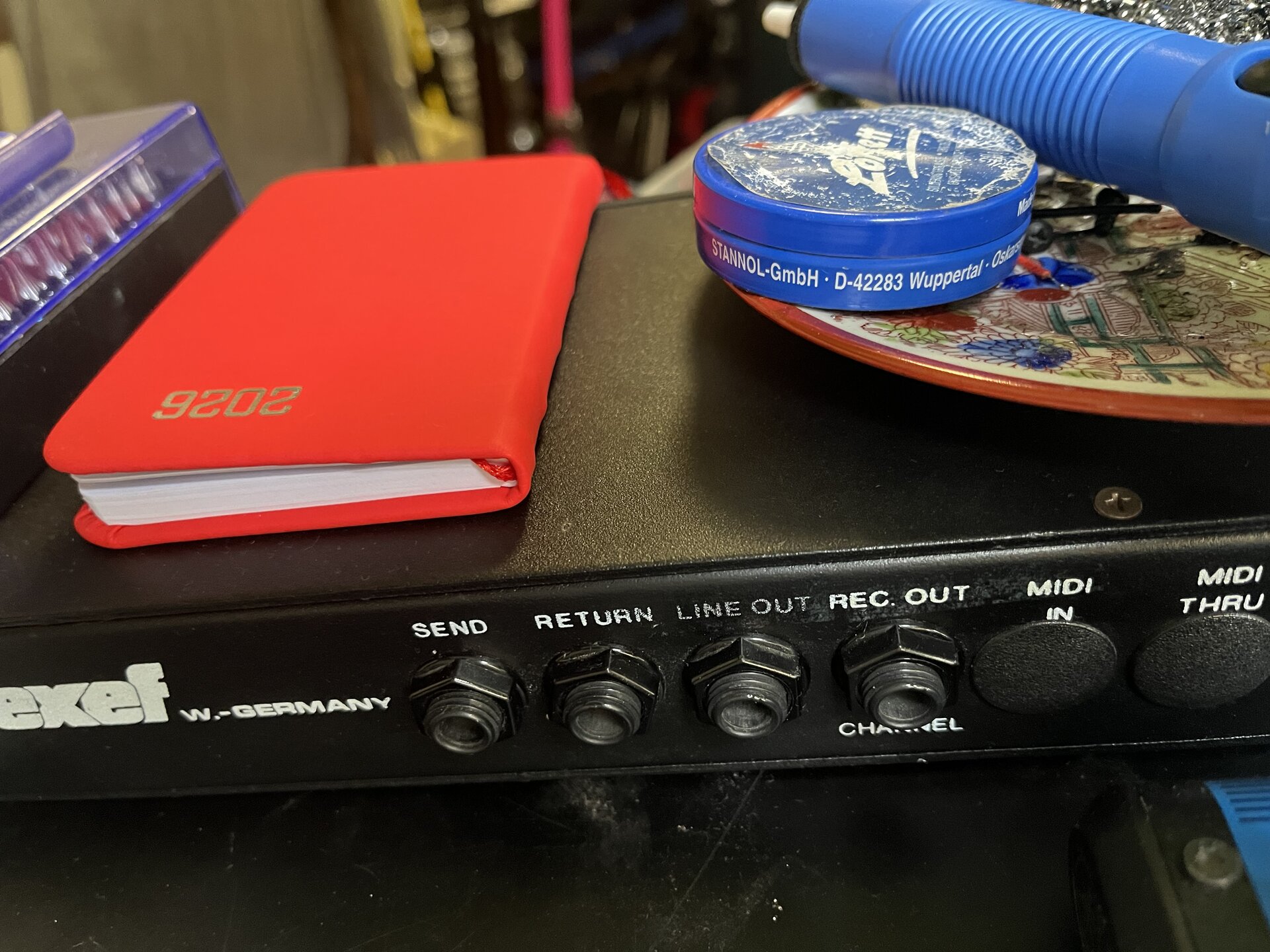 Bei dem "Rec Out" steht unten drunter "Channel", und bei Exef war das normalerweise der Anschluss für einen simplen 2-Knopf Fußschalter mit Stereoklinkenanschluss. Als Gitarrist der Rack-Ära (und nach wie vor Rack-User) kann ich mir beim besten Willen nicht vorstellen, welche Verwendung jemand für einen 3-Kanal-Rackpreamp gehabt hätte, den man nur von vorne per Hand umschalten kann. Das müsste dann schon jemand nachträglich umgebaut haben. Es liegt eher daran, dass die gleiche Rückwand eben auch für MIDI-Versionen und vor allem auch für den programmierbaren 6-Shooter-Preamp benutzt wurde. Letzteres sieht man am Blindstopfen mit der Aufschrift "Wah", den der hatte eines eingebaut, das über ein hier angeschlossenes Exp-Pedal bedient werden konnte. Jedenfalls hatte der auch einen Stereo-Recording-Out an exakt dieser Stelle, während mir davon beim Triton nichts bekannt ist.