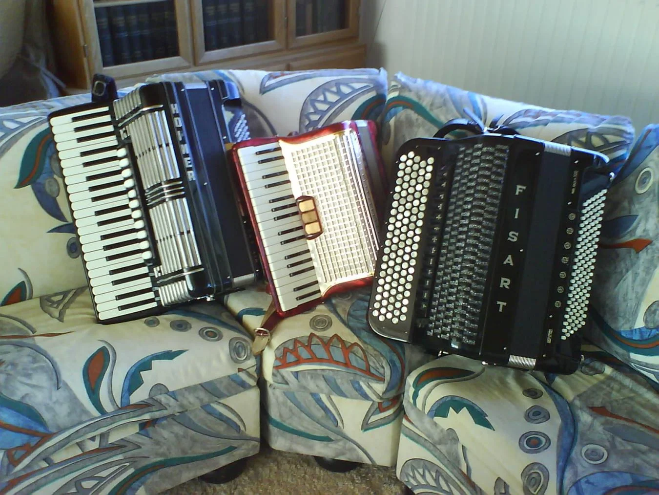 Und da ich mich überhaupt nicht als Profi fühle, kam ich mir mit nur einem Akkordeon unterinstrumentiert vor. Also holte ich als erstes mal meine alte Concerto II, mit der ich vor mehr als 40 Jahren angefangen hatte, aus der Versenkung. Aber damit fühlte ich mich immer noch als Halbprofi. Irgendwie mussten drei Instrumente doch zu erreichen sein ...