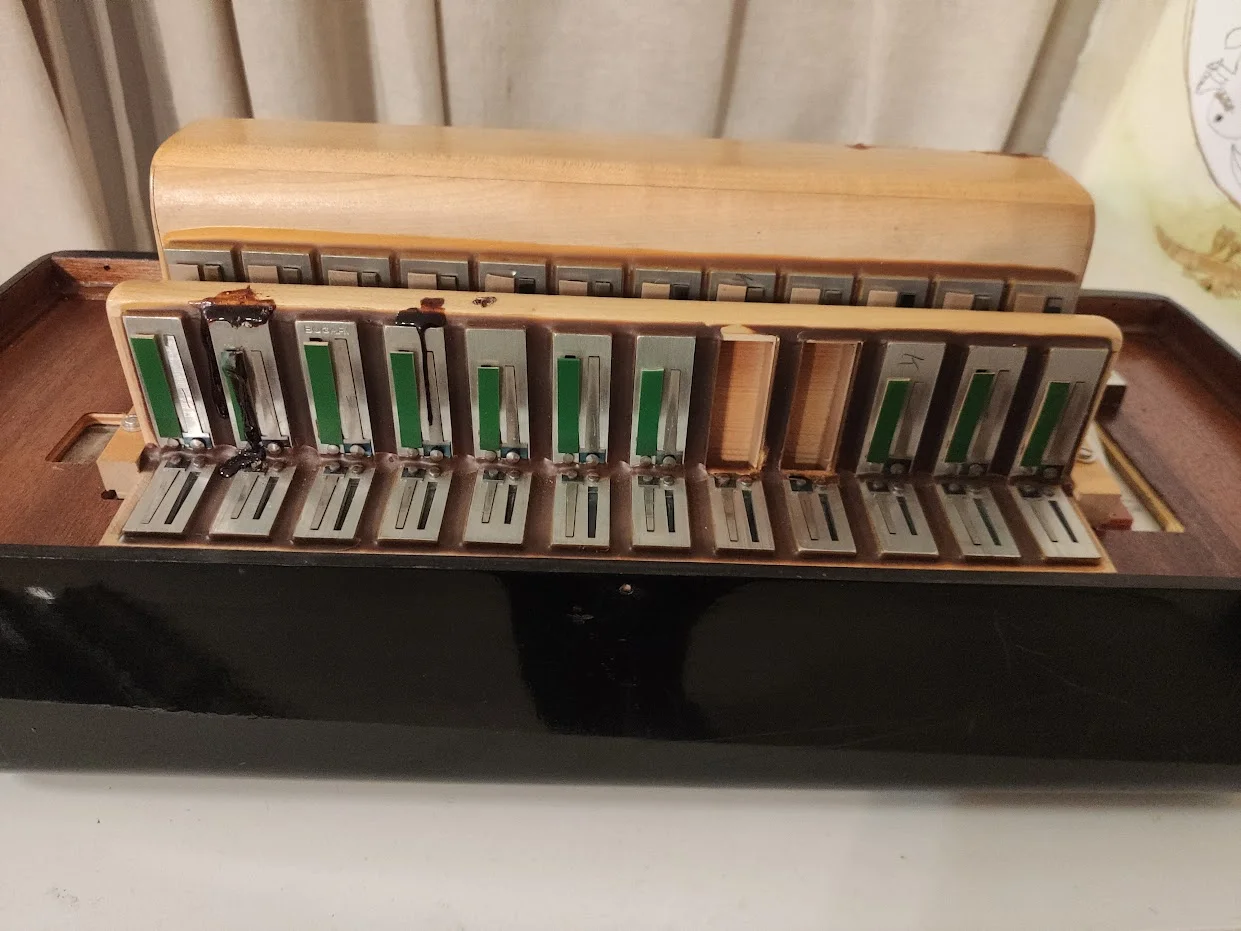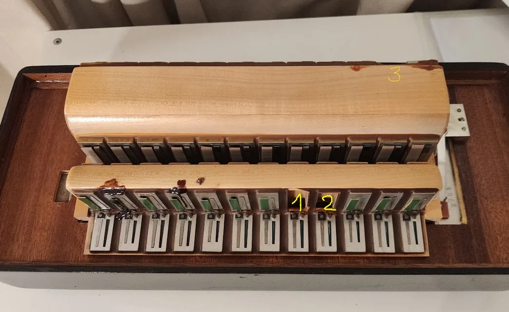 Ein elektronisches Stimmgerät danebenlegen und die, z.B. unterhalb der 1 + 2 markierten Stimmplatten, liegenden Stimmplatten mit einer Pinzette etc. anzupfen. Das Stimmgerät zeigt an um welchen Ton es sich handelt. Im Bass gibt es ja nur 12 Töne pro Chor, die nenne ich jetzt mal Zeile. Bei den in einer Spalte liegenden Stimmplatten handelt es sich um denselben Ton aber meist in anderen Oktave. Um die Oktave der fehlenden Stimmplatten zu analysieren kannst Du vielleicht die anderen Töne die auf diesem Chor liegen vom Stimmgerät bestimmen lassen und dann müßte sich erschließen lassen welcher Oktave die fehlenden Töne angehören.