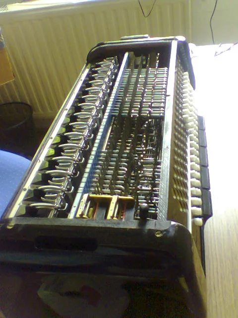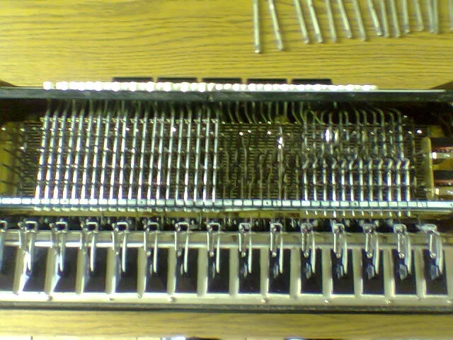 ) hatte ich die Zeit, um die Fehler in der Baßmechanik zu korrigieren. Dazu, um ranzukommen, mußte jede Taste einzeln ausgebaut werden. Wenn man dabei nicht Ordnung hält, kann man sich selbst nachher auch erschießen. Leider hatte ich nur meine Handykamera zur Hand...