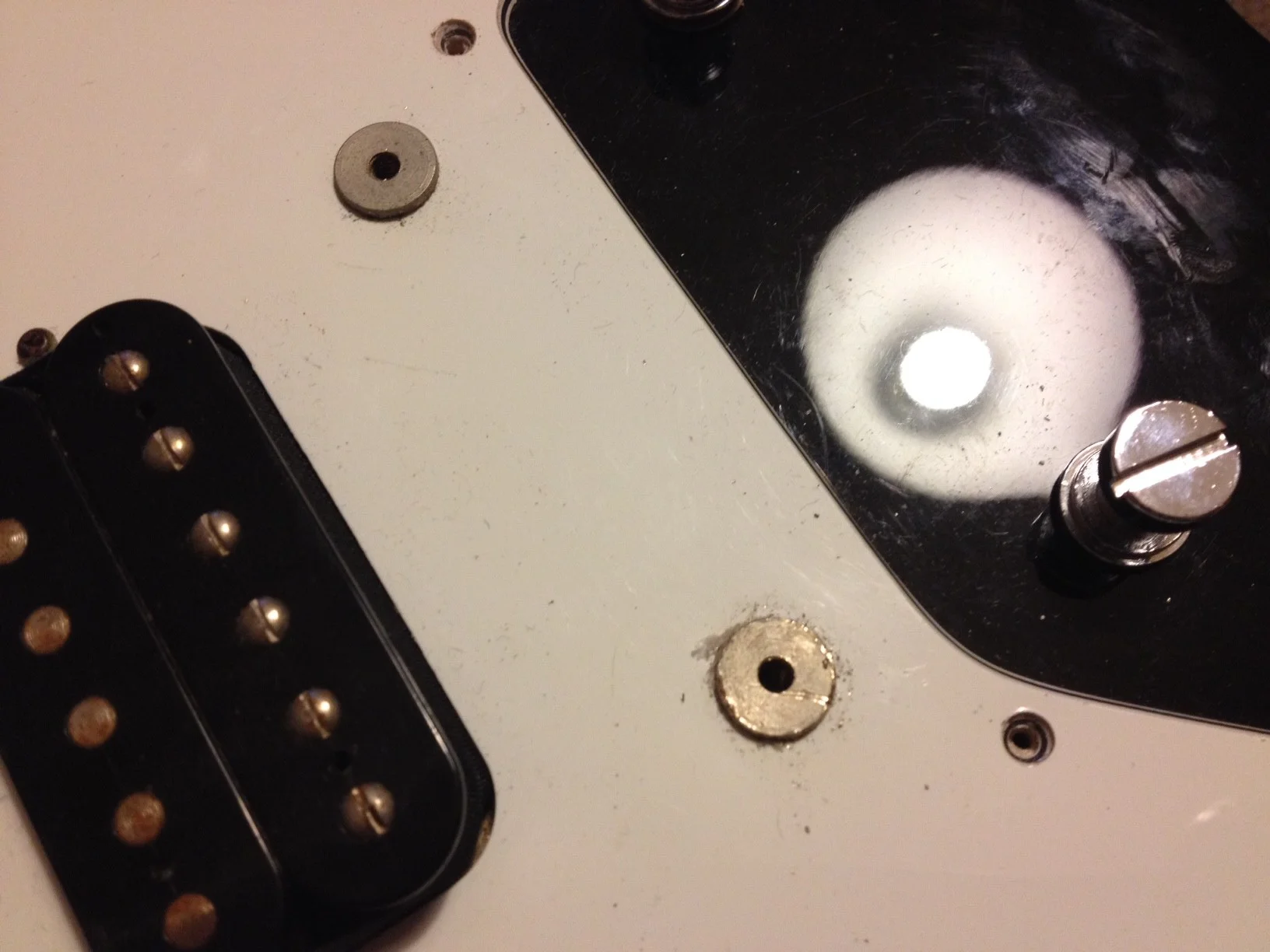 habe ein kleines Problem. Möchte bei einer Epiphone Flying V die Potis und die Pickups tauschen. Da ich bisher noch keine Flying V hatte stehe ich vor einem kleinen Problem. Die Gewindehülsen der Bridge gehen ja durch das Pickguard. Wie bekommt man die am besten raus? Ansonsten kann man das Pickguard nicht entfernen. Gibt es da einen Trick ? Muss ich wirklich mit dem Schraubenzieher unter das Pickguard und die Hülsen raushebeln?