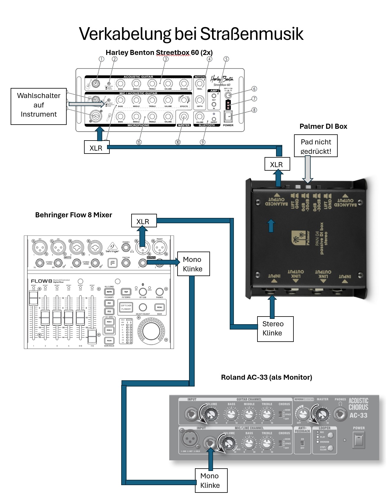 Habe das Problem, mein Flow 8 an eine HB Streetbox 60 (Akkuaktivbox) anschließen zu wollen. Nur, wie? Der Main Out ist nicht auf dem Instrumenten- oder Mikrolevel. Mein gedachter Weg ist, das Phones-Signal abzugreifen und an Line-In der Streetbox zu schicken. Langsam hochfahren und bei Krawall zurückregeln. Habt ihr das bessere Ideen? Die 2 Streetboxen von Harley Benton und das Flow 8 sollen ein Straßenmusiksetup ergeben. Danke fürs Nachdenken!