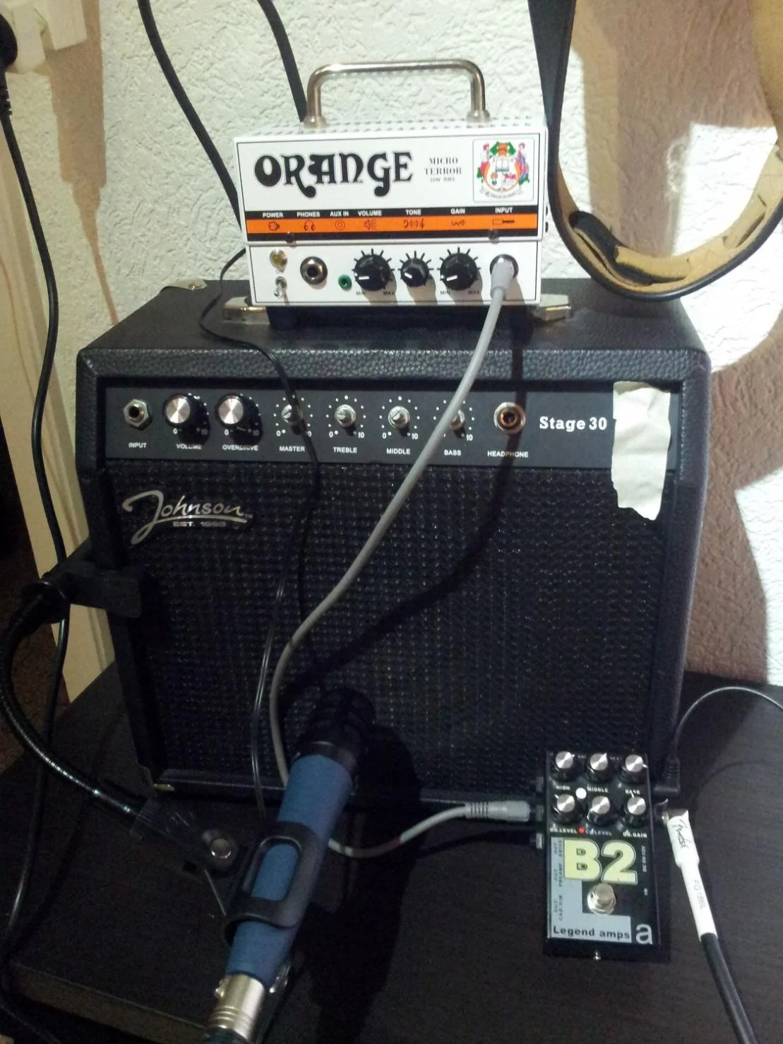Ich hab hier in der Wohnung leider keinen gescheiten Verstärker, deshalb musste für den Test heute ein AMT Legend Bogner Pedal und eine DI-Box von Behringer mit 4x12Cab-Sim herhalten.