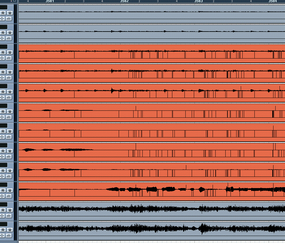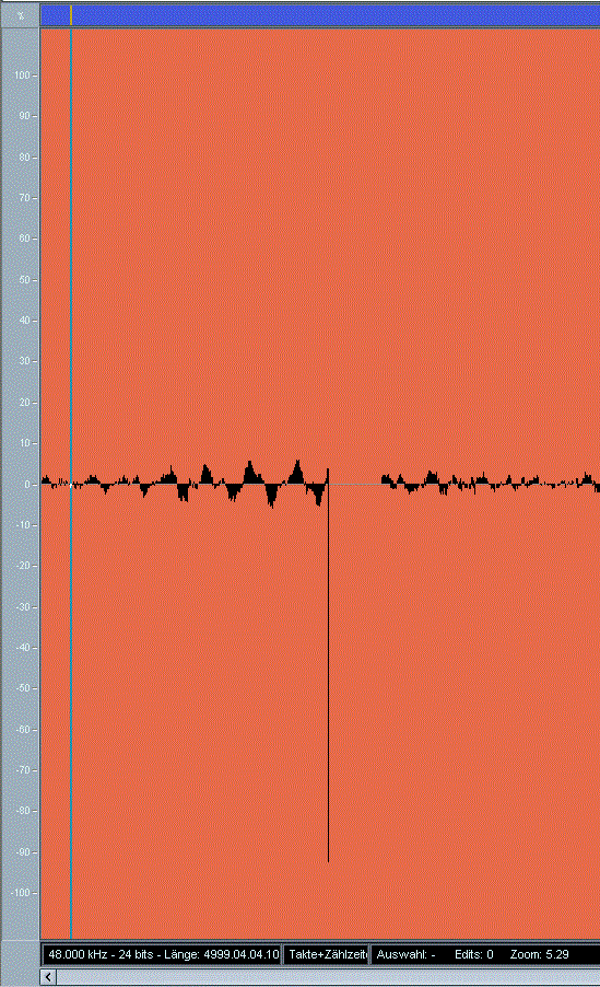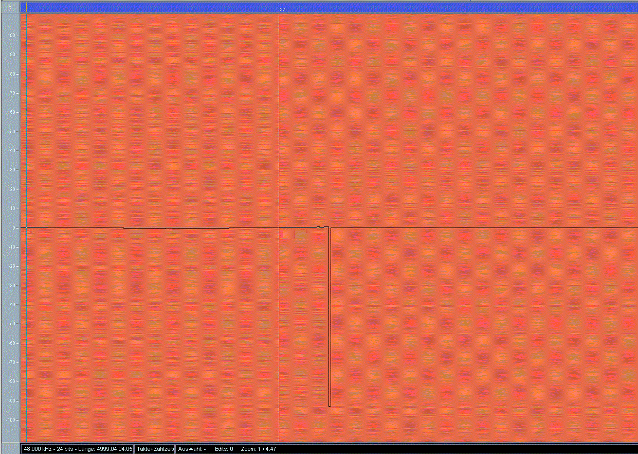 Während der Aufnahme setzte der ADA8000 auf einmal aus und sendete "Knackser" (siehe Screenshots). Meine erste Vermutung war, dass mit dem Wordclock zum ADA8000 etwas nicht stimmt. Hab darauf bei den Kabeln herumgezogen. Nach einiger Zeit lief dann wieder alles normal. Ich bin mir nicht sicher ob es mein "an-den-Kablen-ziehen/zupfen" war das geholfen hat, deshalb möchte ich euch fragen was ihr als Ursache vermutet!