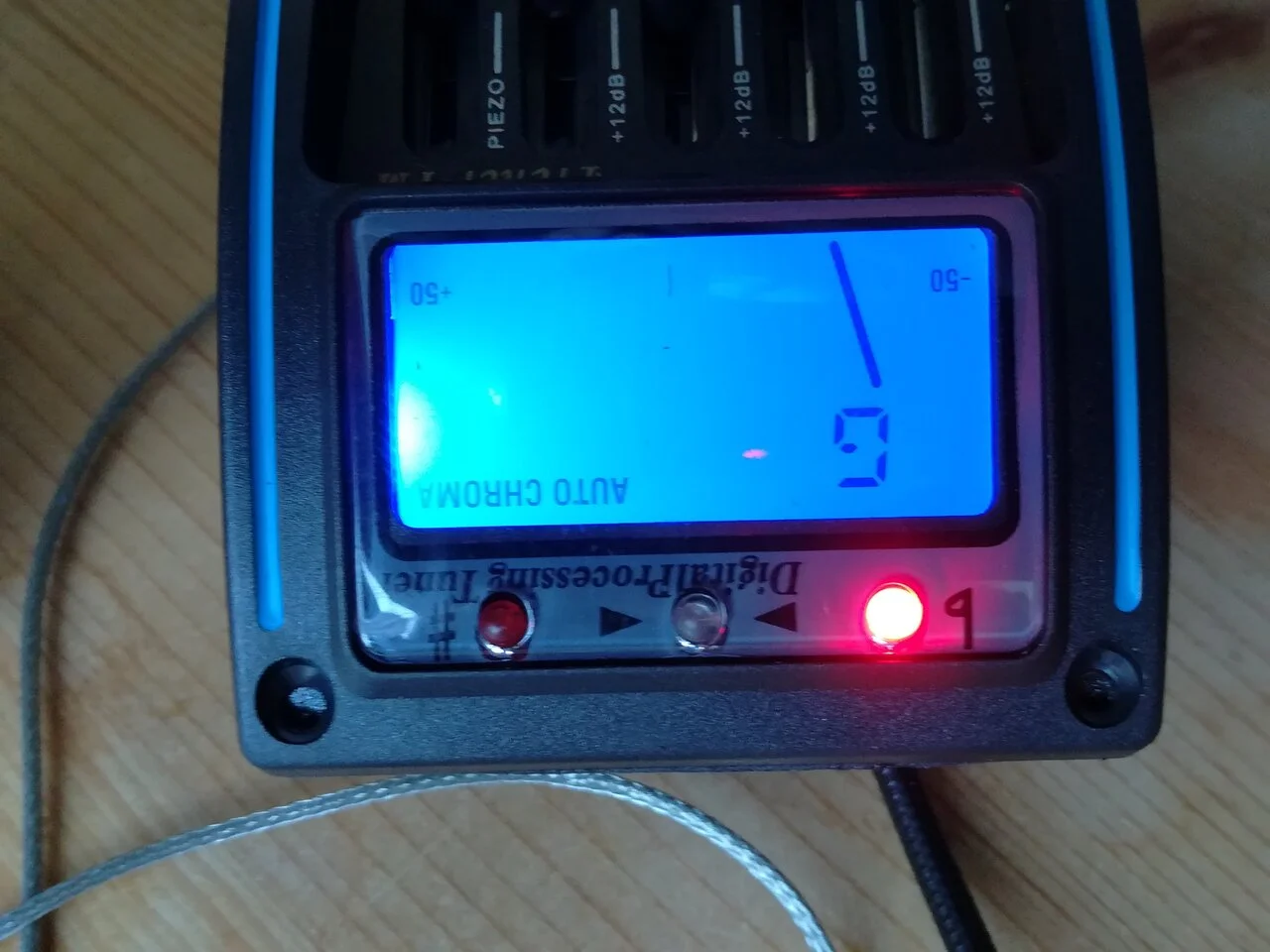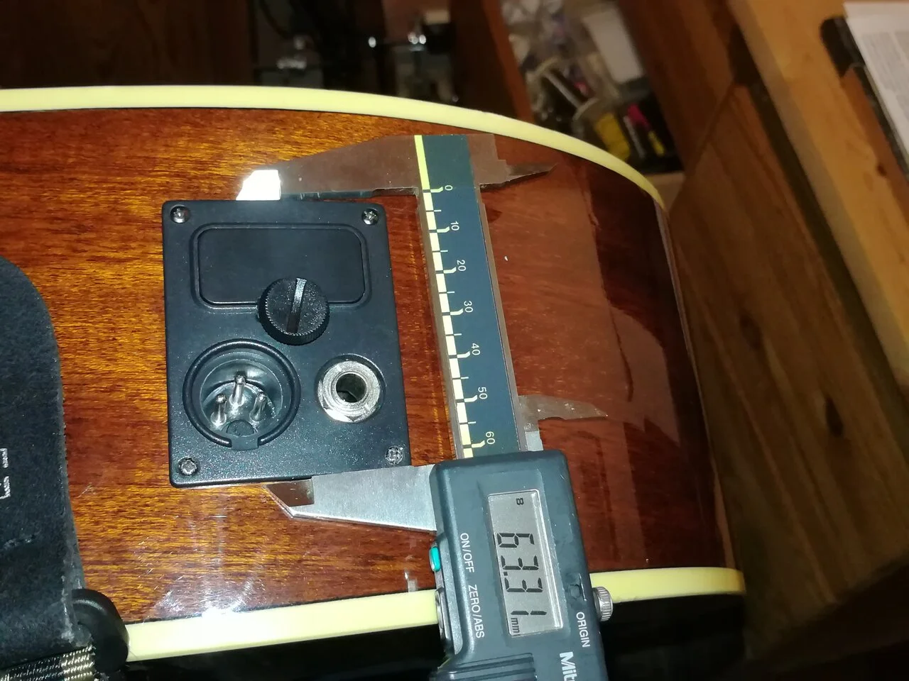 Als nächstes entspannte ich die Saiten, entnahm den Steg und ersetze den Unterstegpiezo gegen den neuen und führte dessen Kabel aus dem Zargenausschnitt raus und schloss ihn an das neue Zargenradio erstmal extern an um den Klang zu testen. Also setzte ich den Steg wieder ein, stimmte die Gitarre und schloss das neue Zargenradio provisorisch an meinen Marshall AS50D an.