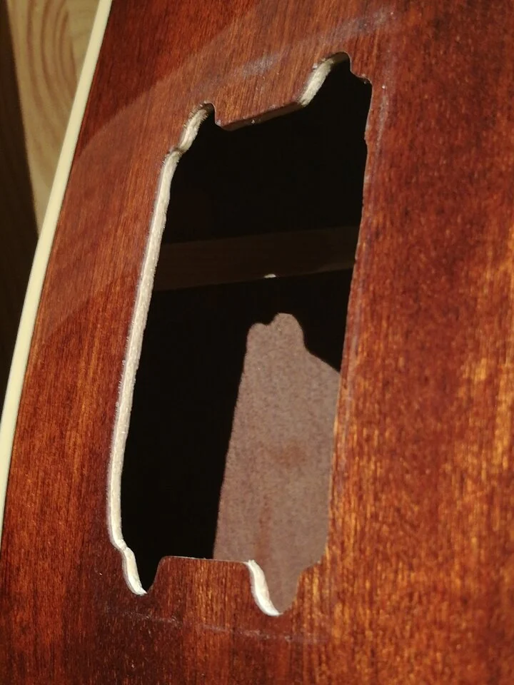 Erst kurz nach Weihnachten war ich wieder in der Lage diverse Gitarrenarbeiten zu machen.Als dann das "Zargenradio" spannungsfrei in den Ausschnitt passte, steckte ich alle Kabel ein, setzte es ein und verschraubte es mit der Zarge.