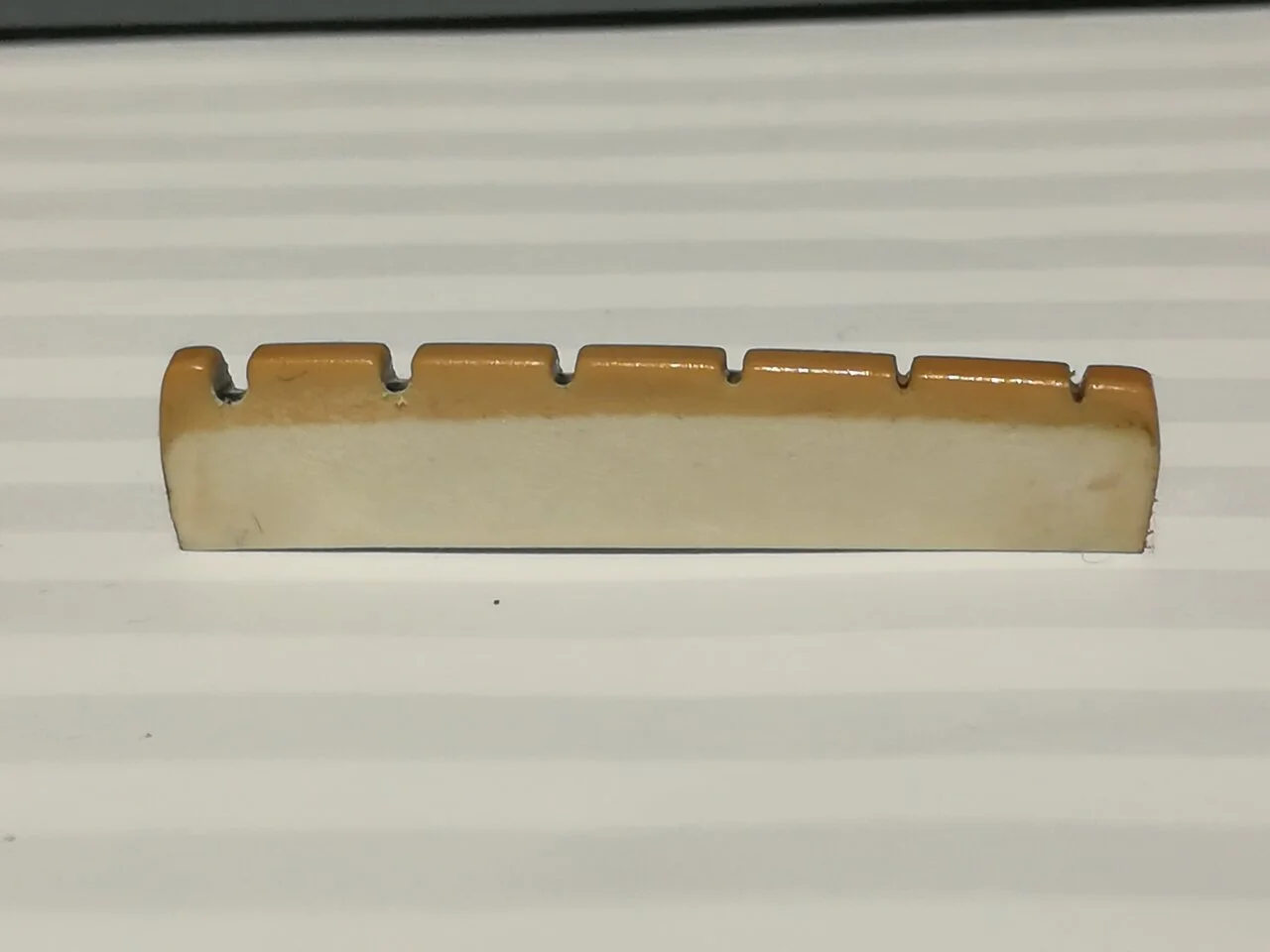 Da die Gitarre schon etwas eingespielte Bünde hatte, richtete ich sie ich sie ab, verrundete sie anschließend mit der Bundfeile und ölte das Griffbrett. Auch die Sattelkerben wurden nachgefeilt und der Steg für eine gute Saitenlage in der Höhe angepasst.